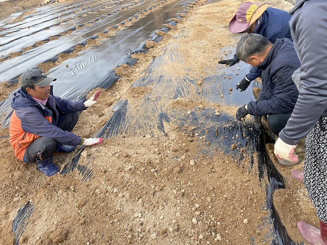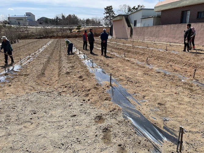 밑거름을 섞어놓은 밭에 두둑 모양을 잡아놓고 그 모양대로 검은색 비닐을 씌워준다.