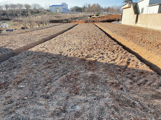 밭에 2m 80cm 정도 씩 간격을 띄워서 말뚝을 박아주었는데 그곳이 나무를 심을 자리라고 한다.