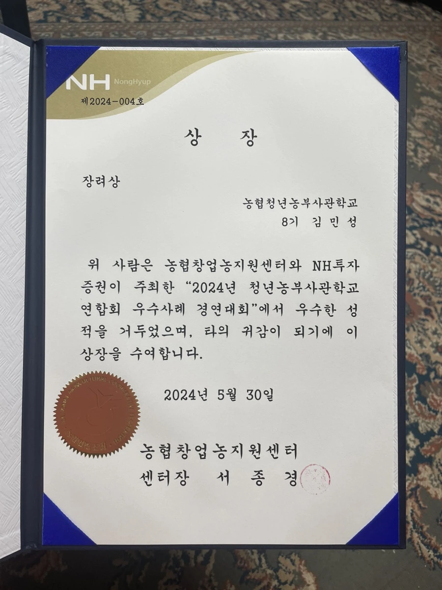 최근 농협 청년농부사관학교 연합회에서 주최한 청년농업인 창농 성공사례 경연대회 본선에 참가하여 장려상을 받았다. 소정의 상금도 함께 받았는데, 아직 창농을 한지 얼마 되지 않은 나에게는 뜻밖의 일이었습니다.