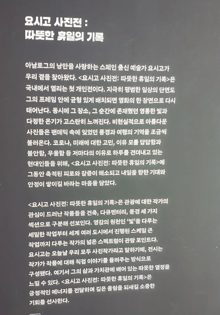 <요시고 사진전: 따뜻한 휴일의 기록>은 관광에 대한 작가의 관심이 드러난 작품들을 1) 건축, 2) 다큐멘터리 3) 풍경 세 가지 섹션으로 구분해 선보인다.