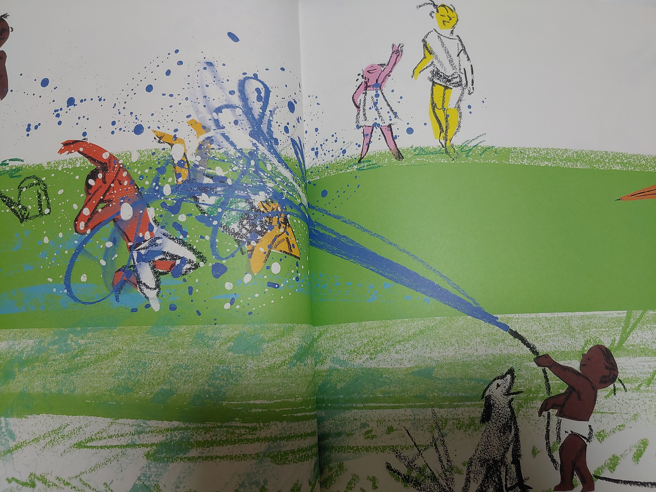 다양한 색의 색종이와 목탄으로 표현된 아이들이 물풍선을 던지며 물놀이를 합니다.
