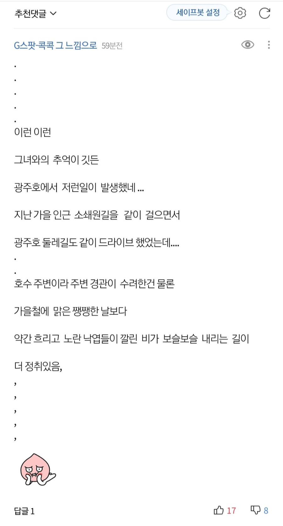 공감의 근본은 표현 방식의 문제가 아니라 프롤로그에서 언급했던 역지사지라고 생각한다. 역지사지가 불가능한 사람은 행동 결정과 이해의 기준이 본인이다. 이런 유형과 대화를 하면 흔히 볼 수 있는 패턴이 어떤 상담이나 화두를 던져도 자신의 경험으로 되돌아가는 것이다. 최근 전남 실종자들이 잇달아 숨진 채 발견되었다는 비보 기사를 보았다. 당신의 반응은 무엇인가? ‘안타깝네’, ‘가족들이 많이 찾았을 텐데’, ‘어떻게 사고가 발생했을까?’, ‘타살이 아닌 건 맞을까’ 등등 벌어진 사건 자체에 대한 반응이 일반적이다. 그러나 사건에 놀라울 만큼 관심이 없는 댓글을 보았다. 언젠가 데이트했던 추억이 담긴 광주호에서 사건이 발생했다는 안타까움으로 시작해서, 호수의 경관에 대한 감탄으로 마무리하는 댓글이었다. 댓글은 꽤 적극적인 관심의 표현일 텐데, 화자가 말하고자 한 주제가 아닌 자신과 관련된 아주 작은 소재 하나가 그의 관심을 끌어당긴 것이다.