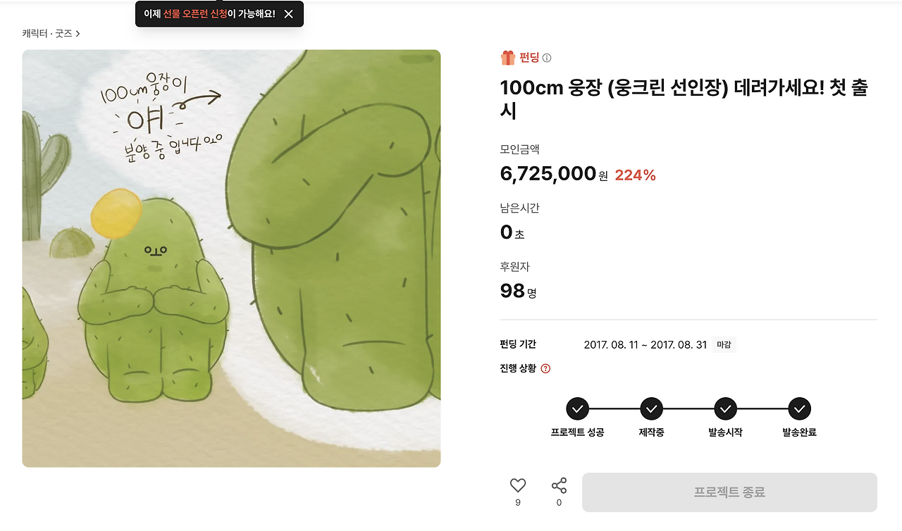 웅바나 샘플링을 마치자마자, 뚱장 인형(웅크린선인장 100cm 인형) 펀딩에 이어 두 번째로 웅바나 인형 펀딩을 진행했다.