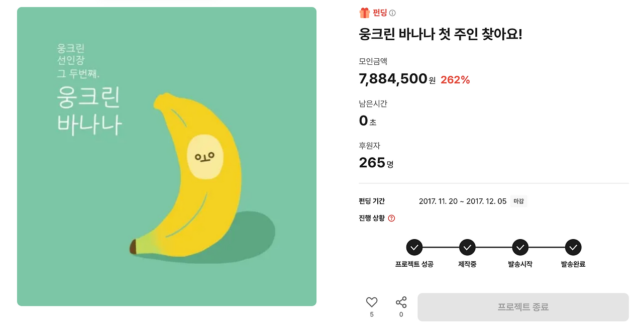 다행히 많은 분들이 좋아해 주셔서 또 한 번 좋은 결과를 만들며 2017년을 마무리할 수 있었던 웅바나 펀딩.