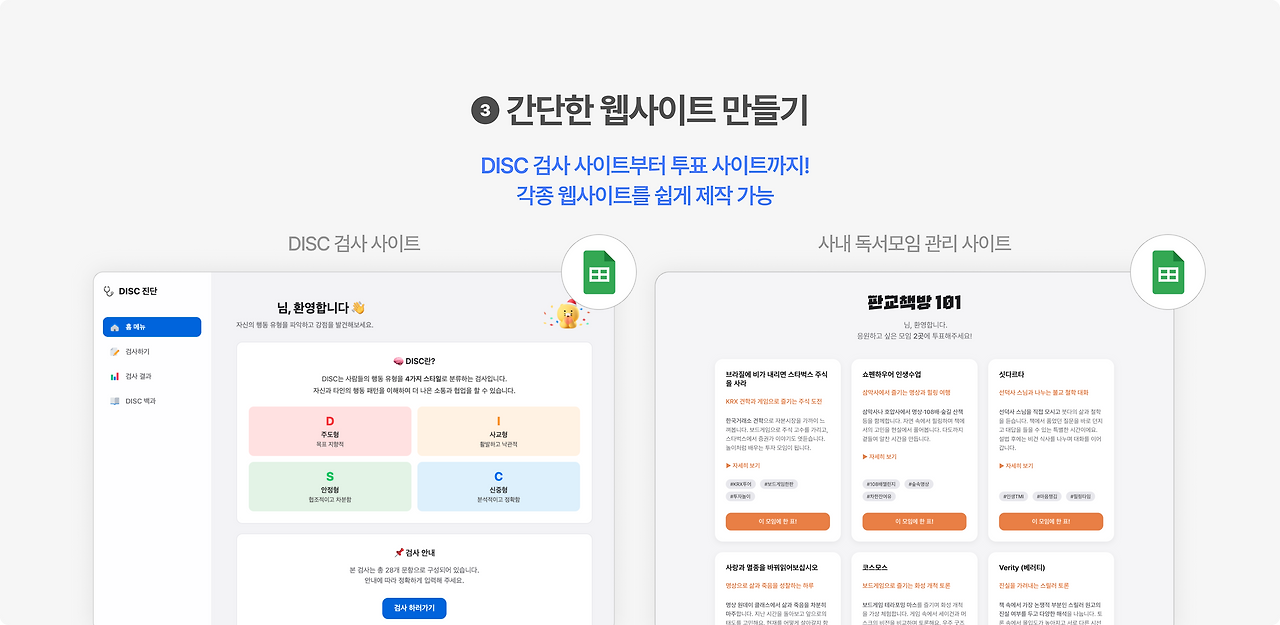 저는 HRD 부서에 몸 담고 있다보니, DISC 검사 사이트나 독서모임 관리 사이트 등 조직개발/학습조직과 관련된 웹사이트를 직접 구축해서 활용하고 있습니다. 예전 같았다면 개발자에게 되나요...? 묻고, 리소스가 없어서 안된다고 답을 받았을 겁니다. 그러나 이제 개발을 하나도 모르는 교육담당자도 필요한 웹 사이트를 쉽게 만들 수 있습니다. 위 예시 외에도 간단한 랜딩페이지는 (정말로) 쉽게 구현할 수 있답니다.
