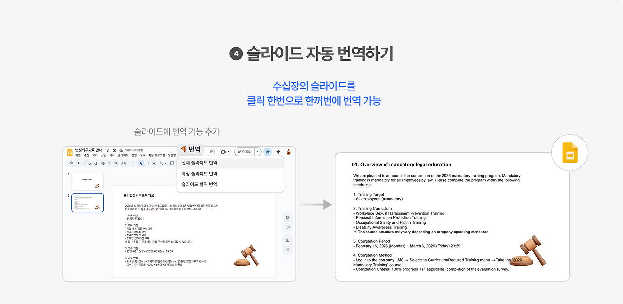 구글 슬라이드의 내용을 영문으로 한 번에 번역하는 것도 Apps Script로 가능합니다.