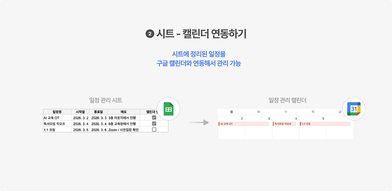 시트에서 여러 프로젝트 일정을 관리 중인데, 이걸 시트 안에서만 보자니 일정이 한 눈에 들어오지 않습니다. 그래서 캘린더에 수기로 옮기려고 하는데, 문제는 여기서부터 시작입니다. 시트에 기록된 일정을 캘린더에 옮기는 것도 귀찮은데, 일정이 바뀌면 시트랑 캘린더 양쪽 모두를 확인하며 수정해줘야 하니까요.
