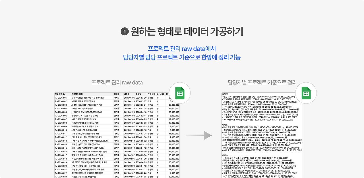 이때 이걸 Gemini로 Apps Script 코드를 한 번만 짜두면, 원본 시트(raw data)는 그대로 두고 원하는 포맷으로 가공된 데이터를 자동으로 뽑아낼 수 있습니다. 즉, 사람이 매번 수행하던 일을 버튼 하나 딸깍으로 대체할 수 있는거죠. 저 또한 다양한 사내 시트 데이터를 내 필요에 맞게 가공할 때면 꼭 Apps Script를 활용하고 있습니다.