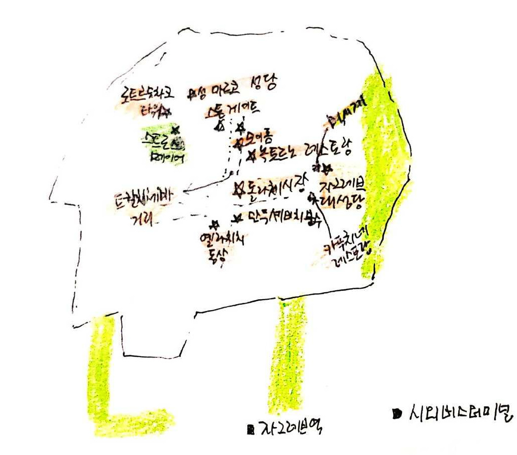 “오시던 길, 여기 트칼치체바 거리는 신흥 카페촌으로 요즘 핫해요.”