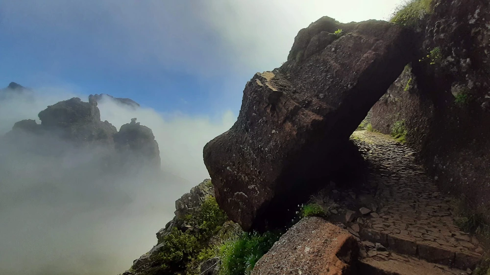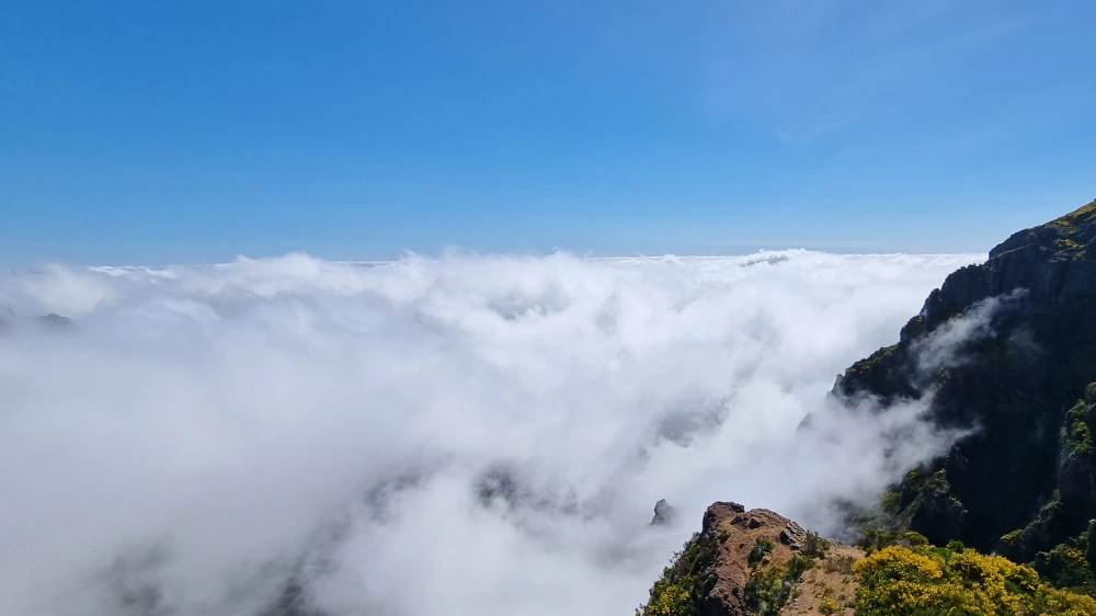 Pico-to-Pico 하이킹이 두 개의 봉우리 사이를 이동하는 경로라 능선을 따라 걷는 평이로운 길일 것이라 생각했는데 실상은 끝없는 내리막길이었다. 이만큼 내려간다는 것은 어디선가 그 높이를 다시 고스란히 올라야 한다는 것이기에 마음이 편치 않았다. 게다가 다시 올라오기 힘든 곳까지 내려가서 기상이 다시 악화되면 큰일이 날 것이었다. 처음 두 시간은 주변 경치에 취해서 그런 걱정을 할 겨를이 없었다. 우리를 감싸고 있던 구름들이 높이가 낮아져 이제 모두 내 발치 아래에 머물러 있었다. 마치 구름 위를 걷는 기분으로 걷다가 때로는 구름 위에 앉아 있는 기분으로 휴식을 취했다. 어느 아슬아슬한 다리를 건널 때는 구름이 오른쪽 발치를 타고 올라와 내 허벅지와 허리를 휘감고는 오른쪽 어깨를 타고 하늘로 올라가는 광경을 그려내기까지 했다. 하이킹을 시작한 지 두 시간 후에 확인한 GPS에 의하면 우리는 계획한 코스의 절반 정도를 온 상태고 아직 한 시간 정도 더 내리막길을 가다가 갑작스러운 급경사를 올라 목적지에 도착하게 되어 있었다. 문제는 이 시점부터 구름이 심상치 않아 보였다. 멀리서 다가오고 있는 구름의 모습을 보니 계속 진행한다면 급경사 지점에서 다시 두꺼운 구름에 싸이겠구나 싶었다. 계속 진행하고 싶은 마음을 억누르는 게 쉽지 않았지만 안전을 우선적으로 생각해야 했다. 결국 중간 지점에서 Pico Arieiro로 되돌아가기로 결정했다. 되돌아가는 길은 내려올 때와 반대로 끝없는 오르막길이었기에 생각했던 만큼 험난했다.