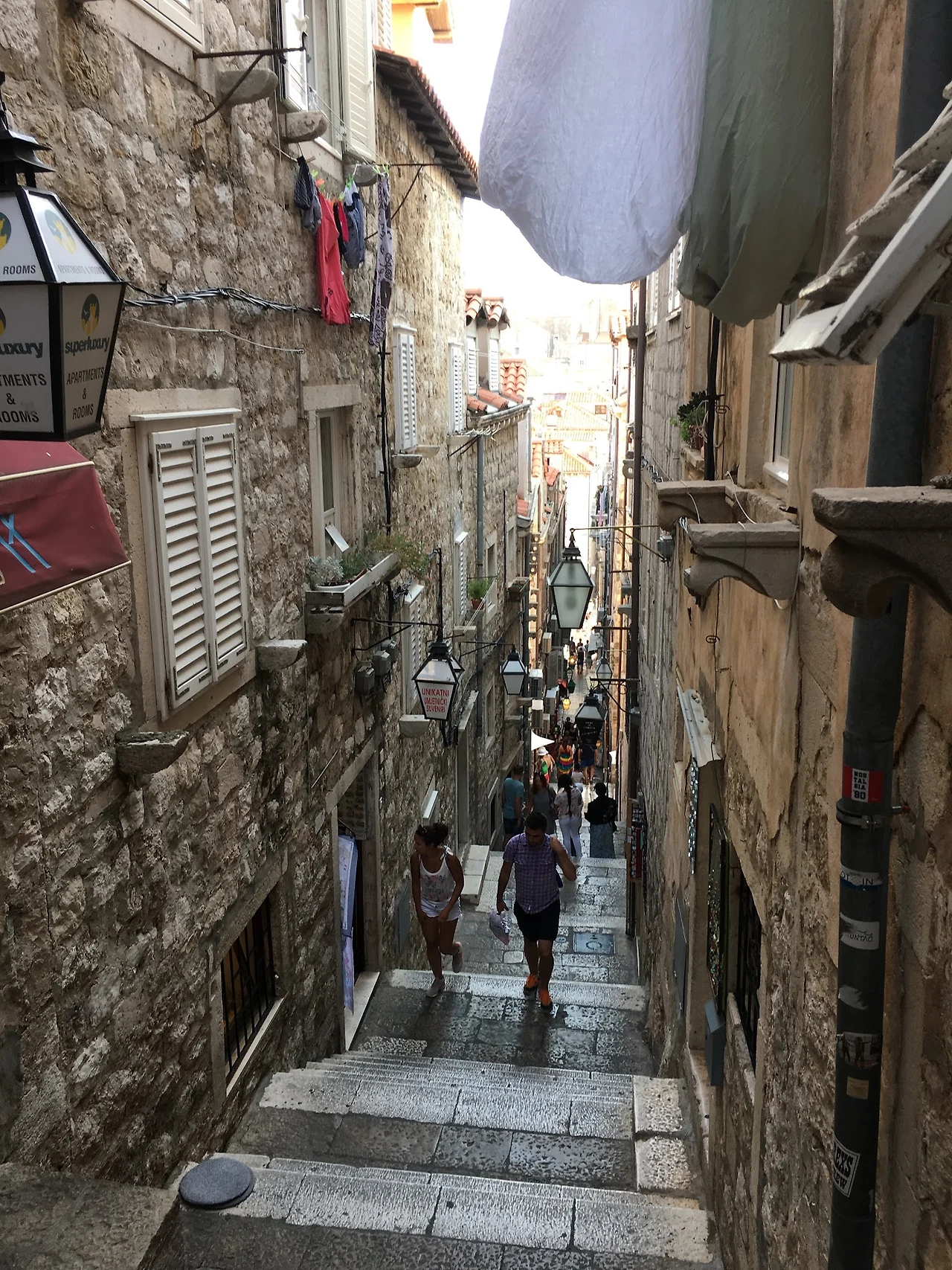 우리는 같이 앉아있기만 하기 어색해서 이것저것 스몰 토크를 시작했는데 어느덧 그 여행자와의 대화가 흥미로워지기 시작했다. 합석자는 수단인 어머니와 스웨덴인 아버지를 가진 독일 출신의 스위스 국적자라는 흥미로운 탄생 이력을 가지고 있었다. 덕분에 독일어와 영어를 섞어가며 서로의 직업, 여행 이야기, 요즘 유럽의 정세까지 이야기를 나누다 처음 일어나려던 시점에서 두 시간이나 더 시간을 사용하고서야 일어설 수 있었다. 뜻하지 않은 만남이었지만 두브로브니크를 생각하면 떠 오를 또 하나의 경험을 한 것이 뿌듯했다. 남은 밤 시간은 맥주를 가방에 채워 넣은 채 플라차거리에서 악사들의 음악을 듣거나 작은 골목골목을 돌아다니며 사진을 찍으며 보냈다. 자정이 넘어서야 숙소로 돌아왔는데 마야의 방은 이미 불이 꺼져 있었다. 아침에 일찍 나가서 스플리트로 돌아갈 예정인데 인사나 하고 갈 수 있으면 좋겠다는 마음이 들었다.