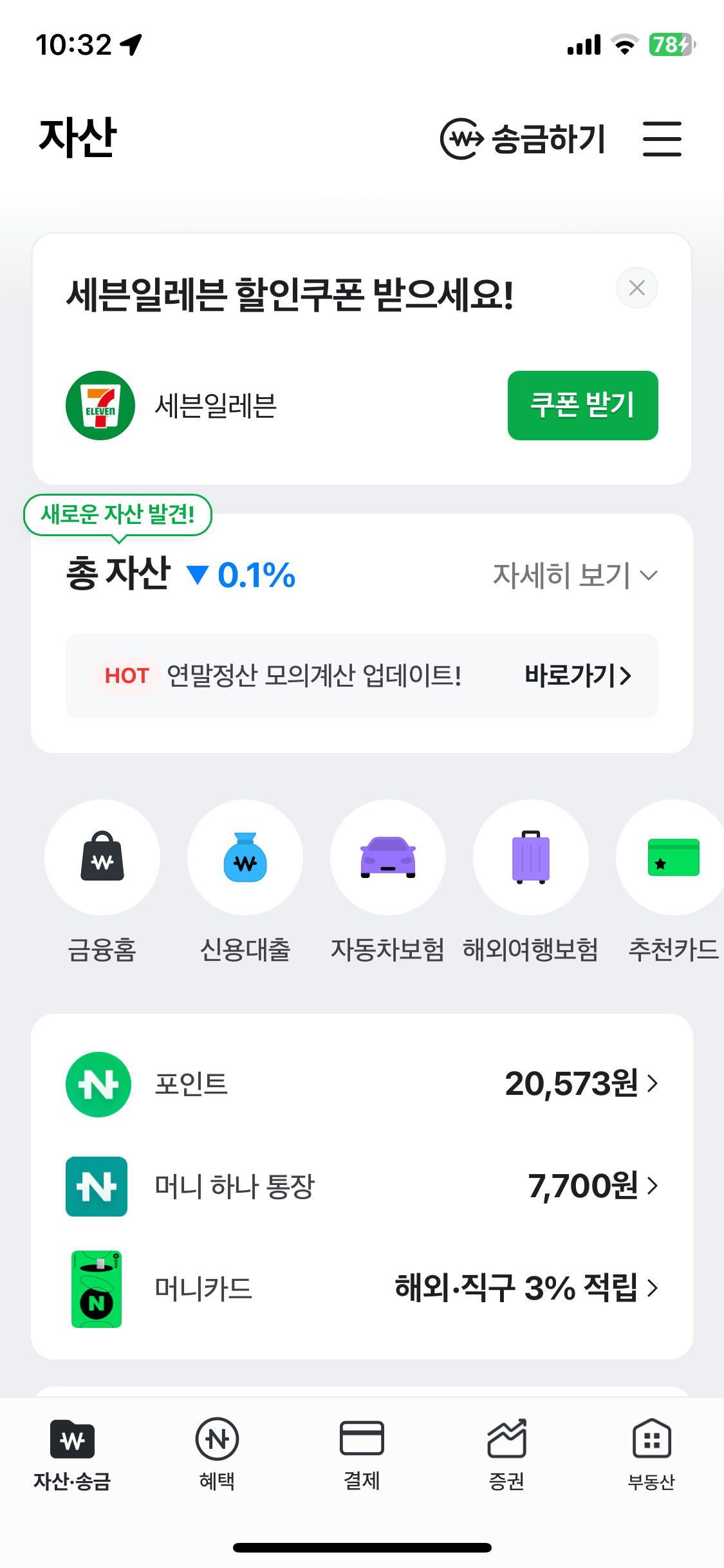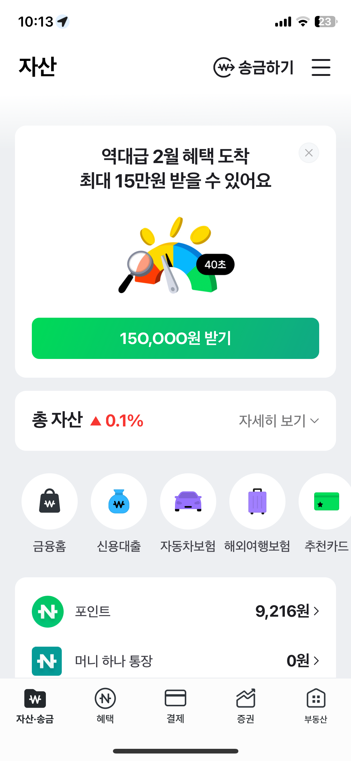 다음은 금융 관련 서비스들이 원 모양 버튼으로 스와이프 된다. 정확히 말하자면 금융 상품들이 깔려 있고 실질적으로 페이 서비스가 돈을 벌 수 있는 상품들이 깔려 있는 것이다. 상품들이 여기서 왜 이렇게 배치했을까 고민이 드는데 금융 상품과 아래 포인트/머니 하나 통장까지 동시에 보여주고 싶은 의도인 것 같다.