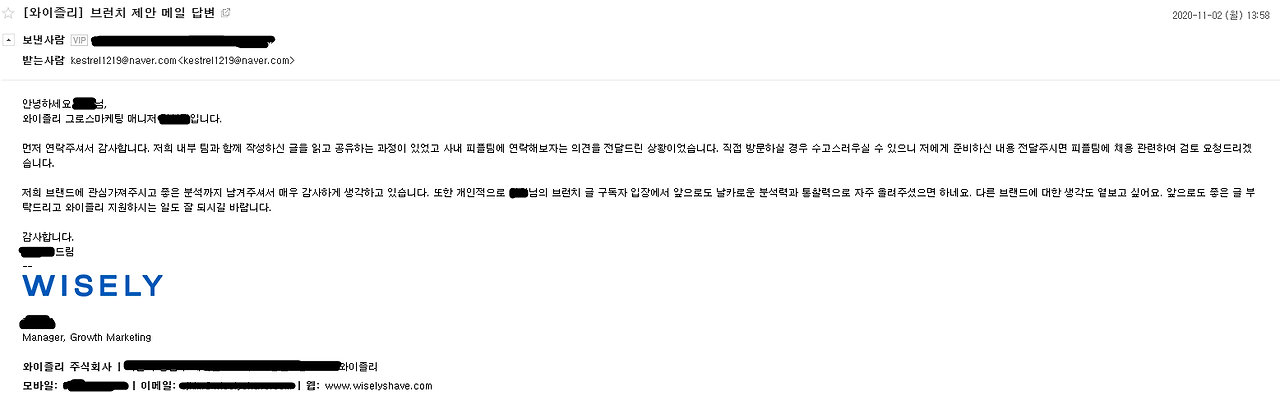 와이즐리 입사를 희망해서 이것저것 조사하던 중 최근 발생한 이슈에 대한 분석글 2편을 남겼다. 그리고 우연하게 와이즐리 마케터 분이 나의 글에 라이킷을 눌러주셨고 나는 기회다 싶어 마케터분에게 입사를 희망한다는 메시지를 보냈다. 그리고 답장으로 위에 메일이 나를 반겼다. 매우 떨리는 마음으로 메일을 열어보았고 내 글을 공유했다는 점에 놀라고 또 놀라웠다.