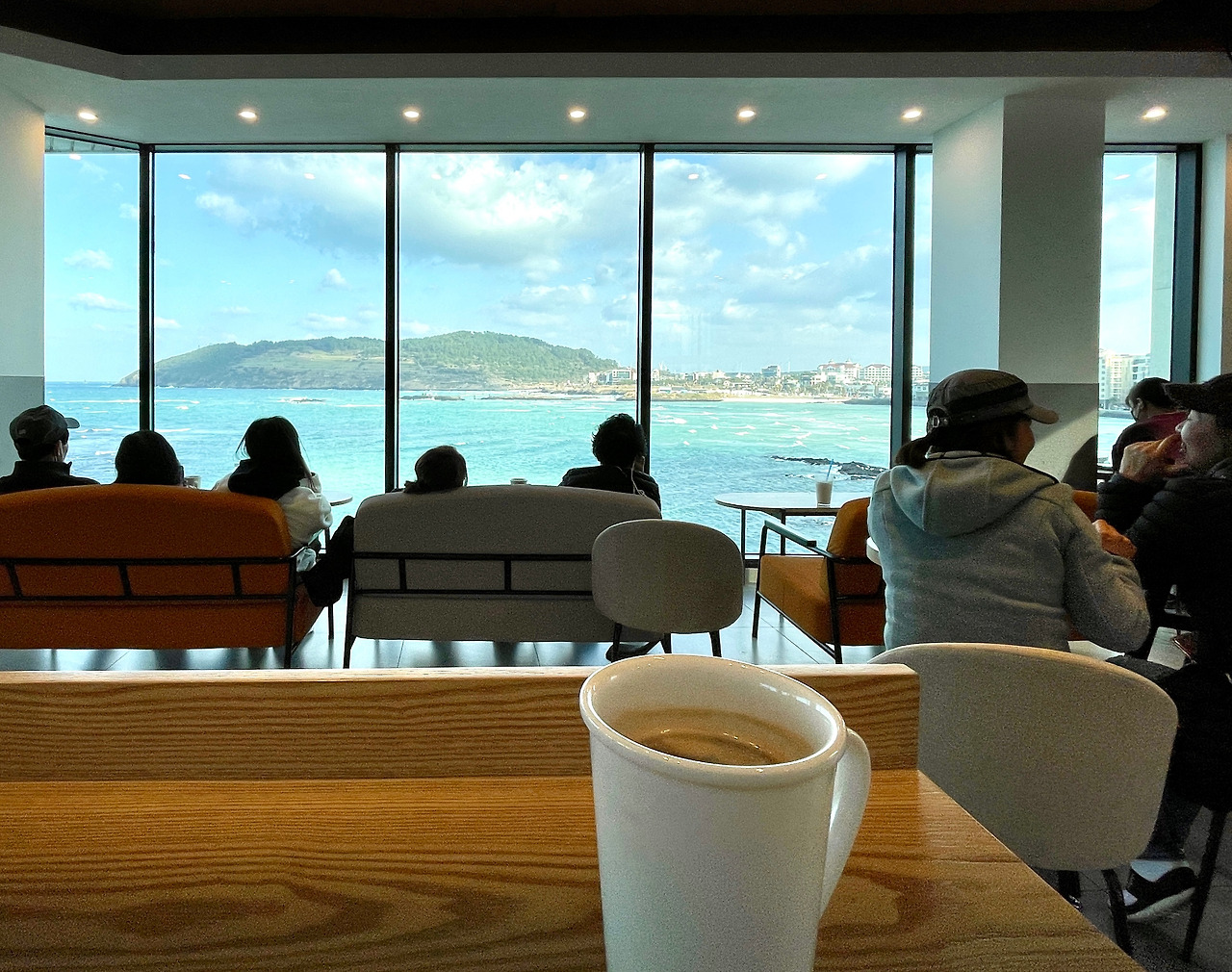 몇 달 전에 바닷가 바로 앞에 빽다방이 들어선다는 플래카드가 붙은 공사 현장을 본 적이 있다. 아메리카노 한잔에 1500원을 받는 저가형 카페 브랜드이기에 당연히 테이크아웃 상점이겠지라고 생각했는데, 오늘 가보니 5층 건물 전체가 빽다방이었다. 2층에서 커피를 주문해 위로 올라가 보니 푹신한 소파들이 창을 보고 늘어서 있다. 게다가 이 뷰는 뭐란 말인가?