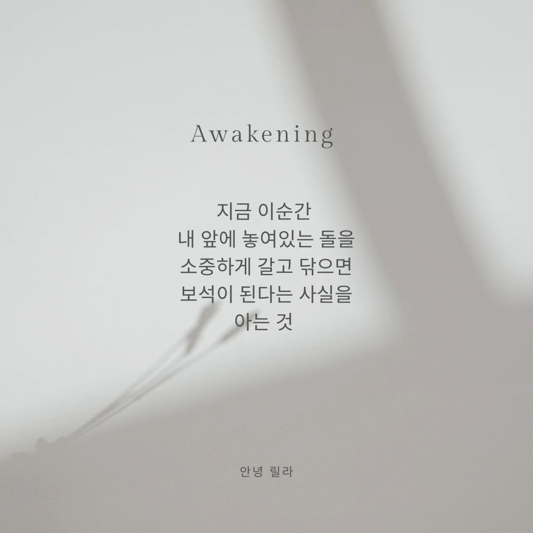 좋고 싫음을 판단하지 않고, 나에게 오는 모든 것들, 내 앞에 놓인 모든 일들, 작고 하찮은 돌들을 소중하게 갈고닦아야겠다는 생각을 한다. 그러다 보면 알게 될 것이다. 나에게는 돌을 보석으로 만드는 힘이 있다는 사실을. 보석을 만들어 내는 매 순간의 여정이 실은 보석보다 더 값진 삶의 정수였다는 사실을.
