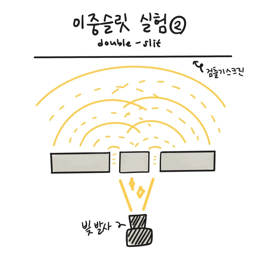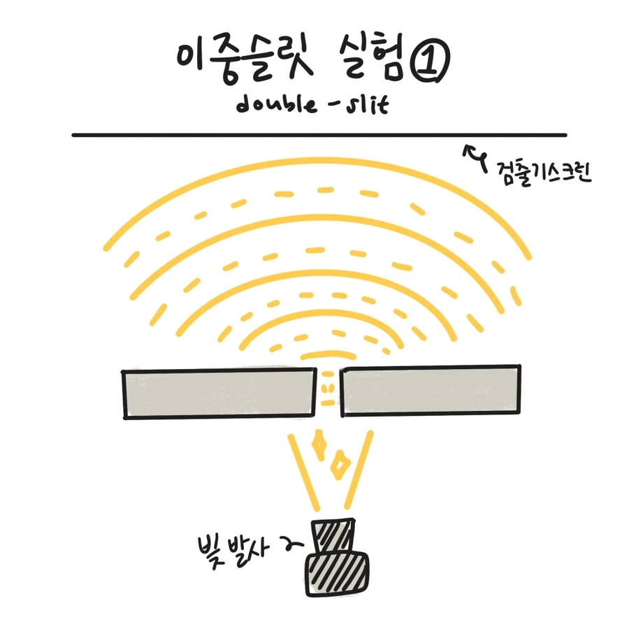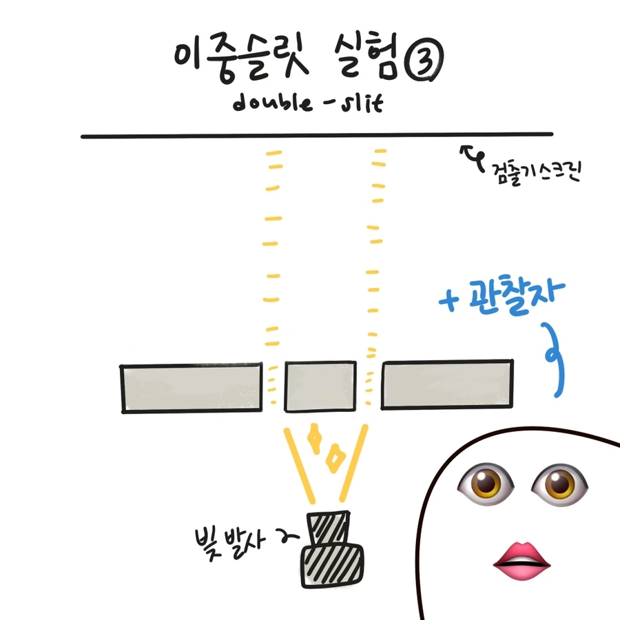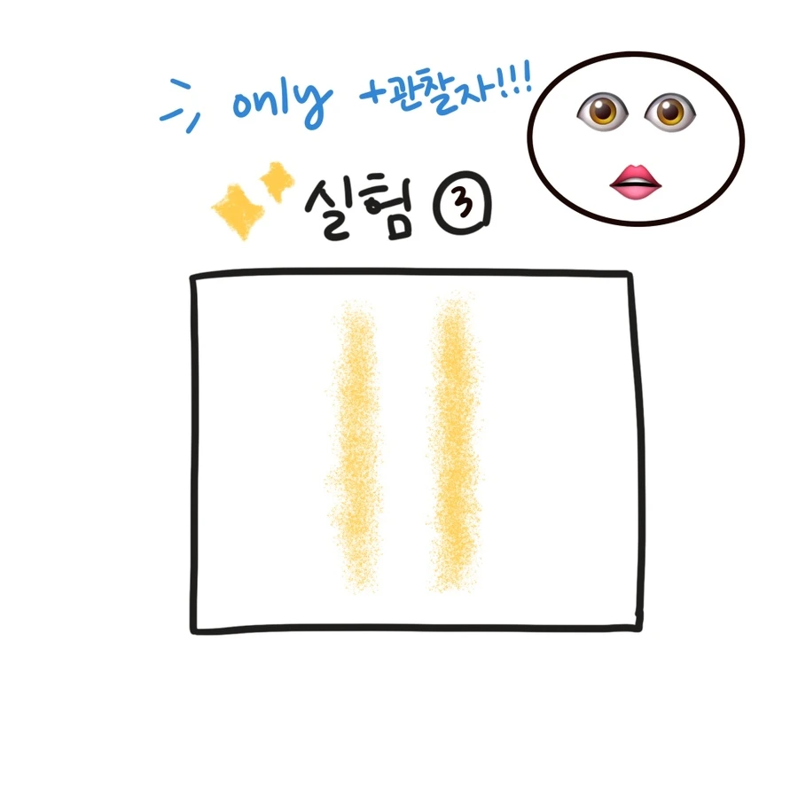 이 글 안에서는 많은 양자역학 실험과 이론 중 1801년 토마스 영이라는 과학자가 발표한 이중슬릿을 그림으로 정리했다. 이중 슬릿 실험은 물의 파동과 빛의 파동을 동일하게 보고, 빛의 파동을 일으켰을 때 그 결과가 똑같이 나오는지 관찰하는 실험이다. 실험 안에서 토마스 영 씨는 원자의 파동 결괏값이 놀랍게도 그 실험을 보는 자. 관찰자라는 변수에 의해 달라진다는 사실을 발견하게 된다.