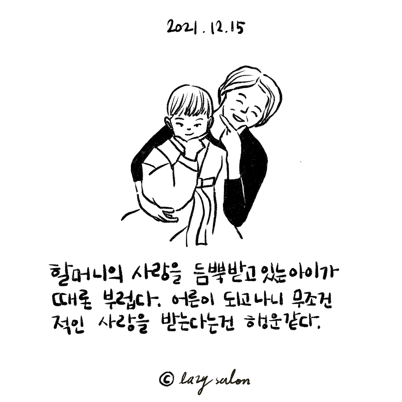 안타깝게도 나는 세 살 때 친할머니가 돌아가시고 외가 쪽과는 연이 닿지 않아서 그런 무조건적인 사랑을 받아본 기억이 없다. 그래서 아이가 할머니와 있을 때 자신만만한 모습이 때론 부럽다. 무조건 내 말만 들어주고, 나만 보면 사랑스러운 눈으로 봐주고, 사고 싶은 거, 먹고 싶은 거 말만 하라고 하는 할머니가 있다면 얼마나 든든할까 생각해보았다. 어른이 되어보니 더욱더 무조건 적인 사랑을 줄 수 있는 존재가 있다는 건 행운이라는 생각이 든다.