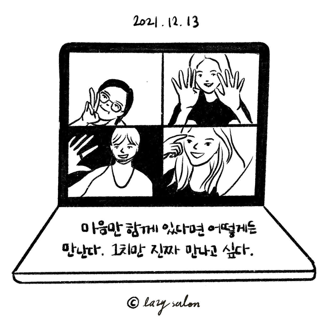 금요일 중요한 약속이 있어서 못 지켜지거나 한 게 아니라 서로가 일상생활에 치여 까마득히 잊고 있다가 9월 중순쯤 누군가가 '우리 근데 줌모임 안 했네?'라는 말로 우리의 모임을 다시 상기시켜 주었다. 10월엔 기필코 다시 만나자고 했지만 12월이 지난 여전히 다시 잇질 못했다. 온라인으로 만나도 여전히 좋고 그립지만 직접 만났을 때와 다른 어떤 아쉬움이 남는다. 화면으로 보고 있으면서도 '보고 싶다~~~'를 외치는 친구들인데 다시 편하게 볼 수 있는 날이 빨리 오길 바란다.