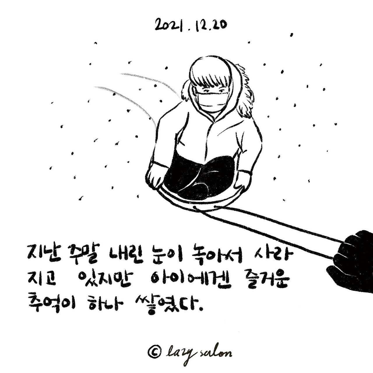 지난 토요일 첫눈이 펑펑 내렸다. 정말 시원~하게 내렸다. 눈은 금방 쌓이는데 아이가 콧물이 나니 선뜻 데리고 나갈 수가 없었다. 이렇게 멋지게 눈이 내렸는데 소원하던 친구들과의 눈싸움은 할 수가 없었다. 친구들을 만나면 기본 1-2시간을 보내게 되니 콧물 나는 아이의 감기가 더 심해 질까 두려웠다. 대신 옷을 꽁꽁 껴입고 아빠와 함께 눈썰매를 가지고 집 앞 놀이터로 데리고 나갔다. 신나게 눈놀이를 하고 들어온 아이는 두 볼이 빨갛고 땀에 젖어 돌아왔지만 만족스러운 얼굴이었다. 그렇게 기다리던 눈이었는데 어제오늘 날이 금방 풀려 따뜻해지니 눈의 흔적이 거의 사라지고 음지엔 슬러시 같은 눈만 남았다. 그래도 아이가 일기에 기록할 만큼 아빠와 탄 썰매의 기억이 남아서 다행이다. 다음엔 꼭 친구들과 눈싸움을 할 수 있기를. 다음 눈 내리는 날을 대비해서 아이 부츠도 주문했다.