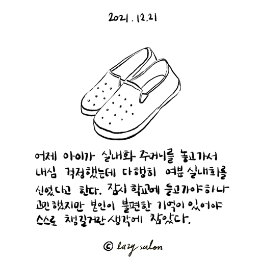 아직까지는 내가 아이 등교를 같이 해주고 있는데 학교 가는 중간에 실내화를 놓고 온 걸 알아버리면 둘이 헐레벌떡 뛰느라 진이 다 빠진다. 도대체 내가 왜 뛰고 있는 걸까, 그냥 혼자 확 보내 버릴까 고민하지만 지난 워킹맘 시절 함께하지 못한 보상으로 같이 가고 있는 거라 조금만 더 같이 가주기로 했다. 지난번 아이가 실내화를 놓고 간 날엔 맨발로 바닥을 다니게 했다고 하니 괜한 걱정이 앞섰다. 얼른 학교 가서 주고 올까. 선생님께 여쭈어 볼까(선생님께 수업방해 일 것 같아서 바로 접었다) 이 추운 날에 바닥이 차가울 텐데 신발이라도 신게 해 주시겠지. 아이가 부끄러워 아무 말도 못 하고 맨발로 그냥 있으면 어쩌지 싶어 별생각을 다한다.