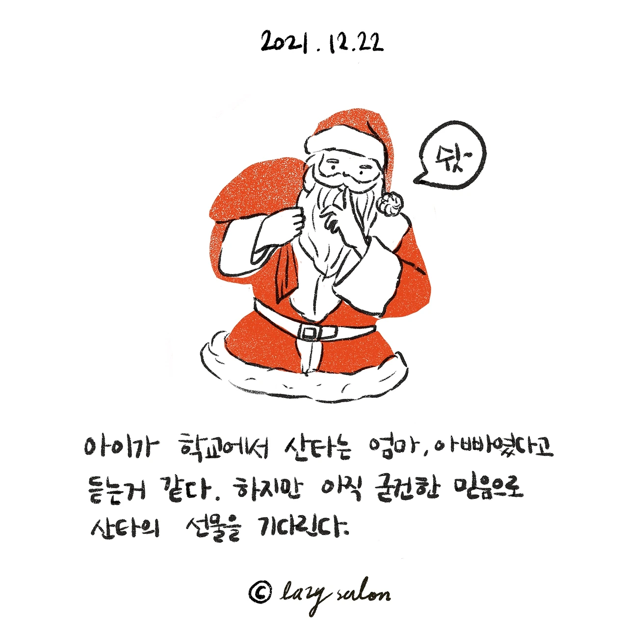 초등학교에 들어가니 눈치가 빠른 아이들은 이미 아는 아이들도 있고 노골적으로 부모에게 요구하는 아이들도 있다고 하는데 아직까지는 믿고 싶지 않은 건지 오늘 아침엔 "엄마 친구들이 그러는데 산타를 믿는 아이는 산타할아버지의 선물을 받고, 산타를 믿지 않는 애들은 엄마 아빠가 선물을 주는 거래."라고 이야기를 했다. 어떻게든 선물은 받겠다는 의지인 건지, 알면서 모른 척을 하는 건지는 알 수 없으나.. 아이의 표정으로 짐작해보면 산타의 존재를 믿고 싶어서 내적 부정을 하고 있는 느낌이다. 과연 언제쯤 현실을 받아들일지 궁금하다. 하지만 엄마는 내년에도 산타가 되어줄 수 있으니 크리스마스를 맘껏 즐겼으면 좋겠다.