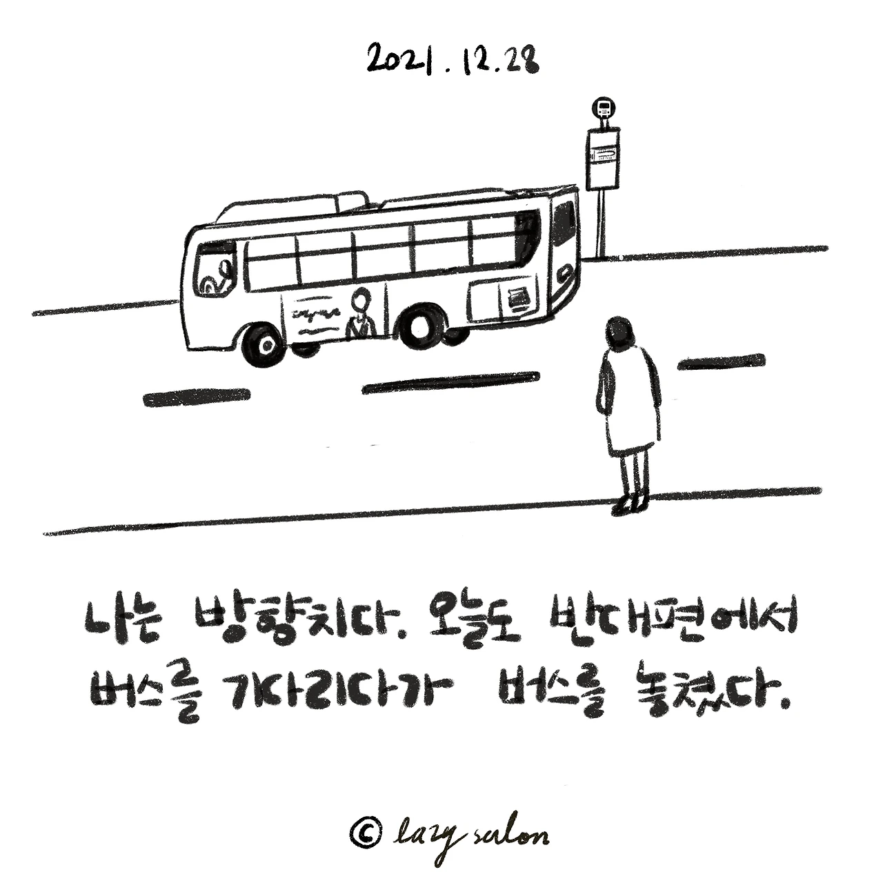 오랜만에 새로운 곳에 버스 타러 갔다가 내가 방향치였다는 사실을 깨달았다. 우리 동네지만 처음 가본 정류장에서 옆동네 가는 길이었는데, 반대편 정류장에서 버스를 기다리다가 버스를 놓쳤다. 그래도 다행인 건 뭔가 싸한 느낌이 들어서 다시 확인하고 길 건너 다시 버스를 탔다는 것이다. 보통은 그 반대 버스를 타고 한참을 달려가다가 알아채곤 한다.
