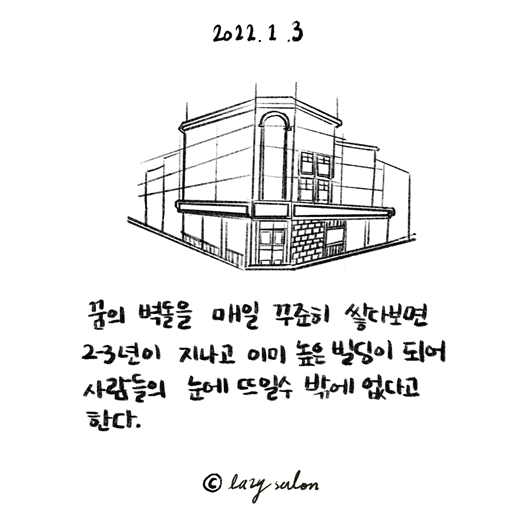 오늘은 월요일이라 그런지 더 졸리고 피곤하다. 보통에도 5시 반-6시에는 일어나기에 5시에 일어나는 게 그리 어렵지 않을 거라 생각했는데 5시에 일어나는 건 6시보다 훨씬 더 몸에 무리를 주는 일이기에 전날 밤에도 일찍 자려고 노력해야 하고 늦게 자면 낮에도 계속 피곤해서 쉽지 않구나 생각했다. 나는 항상 작심 4일째 슬그머니 그만두었던 것 같은데, 이번만큼은 끝까지 가보고 싶다. 14일의 끝이 아니라 나만의 빌딩을 지을 때까지의 끝이다. 내가 언제 치열하게 살아본 적이 있던가. 항상 설렁설렁 살아왔기에 이번엔 제대로 해보고 싶다. 매일의 그림 일기도 나의 꿈의 벽돌 중 하나이다. 내 부계정 아이디로 SNS에 매일 쌓고 있다. SNS엔 각자의 꿈의 벽돌을 쌓기 위해 깨어 있는 사람들끼리 동질감을 느끼며 서로가 서로를 응원하고 격려한다. 혼자 하는 것보다 동료들이 있으니 더 든든하고 힘이 된다.