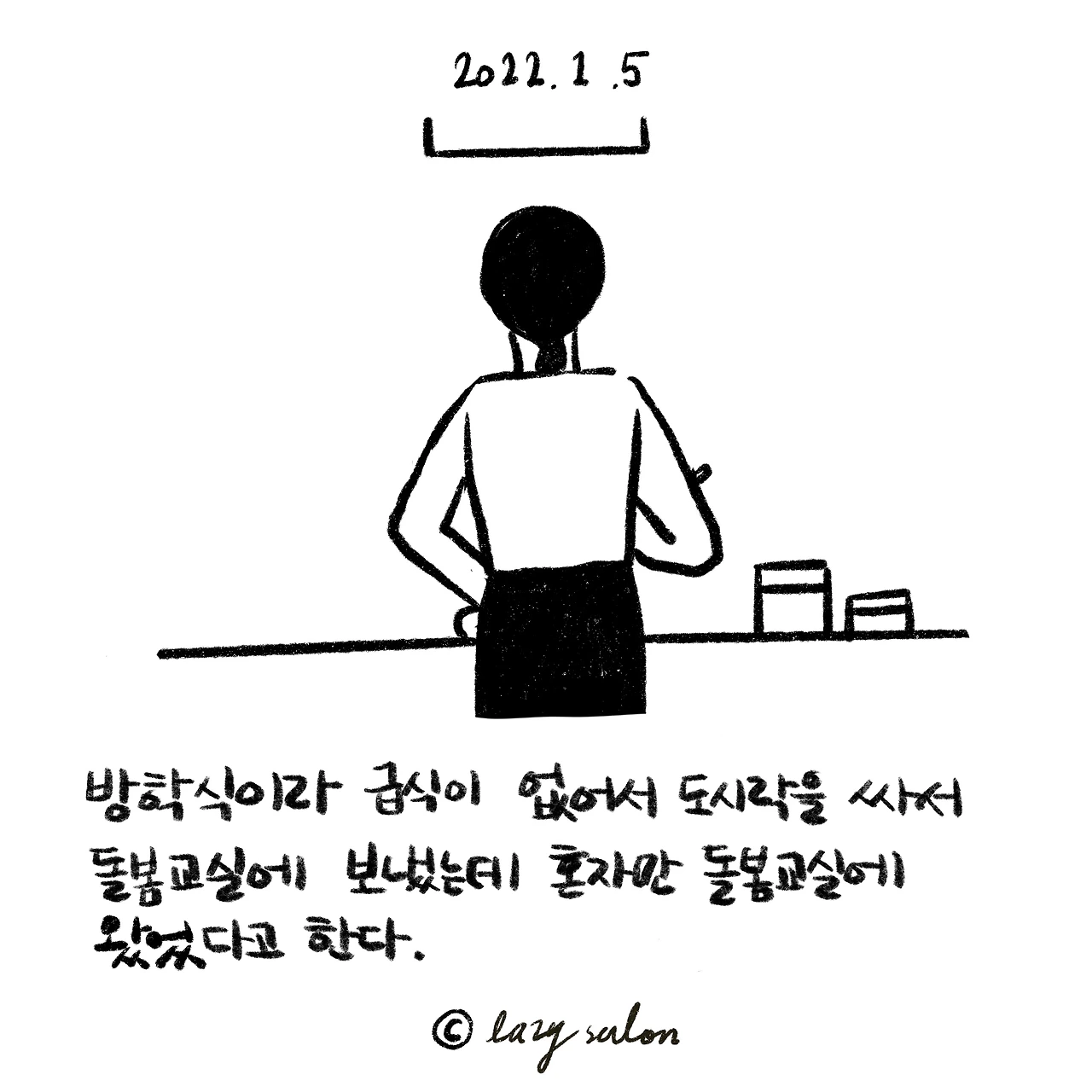 오늘의 이야기는 밝게 끝내고 그림을 그리고 있는데 엄마의 미안한 마음이 후벼 파이는 전화가 왔다. 돌봄 선생님의 전화를 받아보니 방학이라고 다들 집에 가고 아이 혼자 돌봄에 왔다고. 신이 나서 도시락을 싼 아이의 얼굴이 떠올라 마음이 쓰렸다.