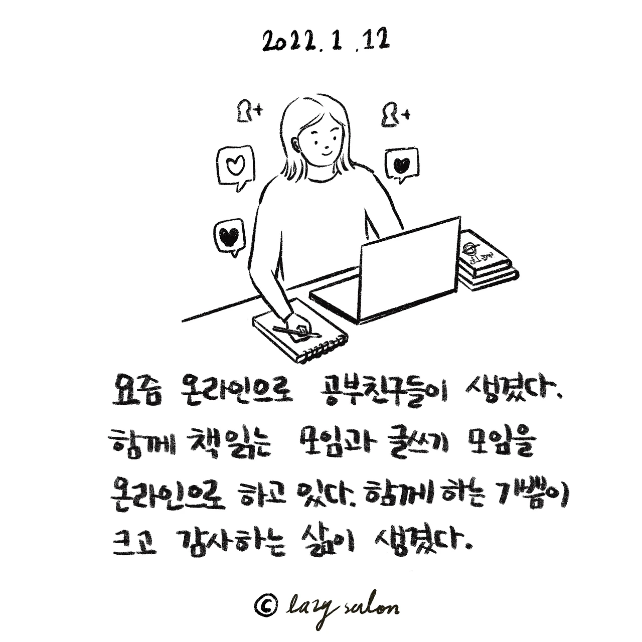 요즘 온라인으로 공부 친구들이 생겼다는 게 신기하다. 글쓰기 모임에도 인스타 계정에도 공부 친구들이 한 마디씩 해주고 좋아요를 눌러주면 힘이 된다. 어떤 때는 현실 친구보다 위로가 될 때도 있다. 현실 친구에게 매일 할 수 없는 소소한 이야기들을 온라인상에 하면 함께 공감해주는 친구들이 있다는 게 든든하다. 혼자 했으면 제대로 못 했을 것 같은 공부들도 함께 하고 있으니 그 과정도 즐거워졌다. 뭐든 혼자 제대로 하고 있는지도 모르고 우선 해보자로 시작하지만 끝을 맺은 적이 거의 없었던 것 같은데, 여럿이 모여서 본인의 생각을 이야기하고 서로의 생각을 듣는 시간을 온라인으로 할 수 있다는 게 대단하다고 느꼈다. 예전엔 친한 사람들과 함께 나누고 싶어서 읽었던 책 중 좋았던 책을 소개해주기도 하고, 관심 분야를 나누고 싶었지만 지속되긴 힘들었다. 친한 친구들은 책에 관심이 없었고, 책을 추천하더라도 읽는 친구가 없었는데 글쓰기 모임의 친구들은 책을 추천해주니 바로 도서관에서 대여하거나 구입해서 읽었다. 책 추천하는 것조차 기쁜 일이 되었다. 언제부턴가 나도 책을 나눌 수 있는 친구가 있었으면 좋겠다고 생각했던 적이 있었는데 책 모임에 들어갈 생각은 하지 못하고 그런 친구들이 있는 사람들을 부러워만 했던 것 같다. 그런데 이렇게 취미와 공부를 함께 할 수 있는 랜선 친구들이 생겼다는 게 너무 감사하고 즐겁다.