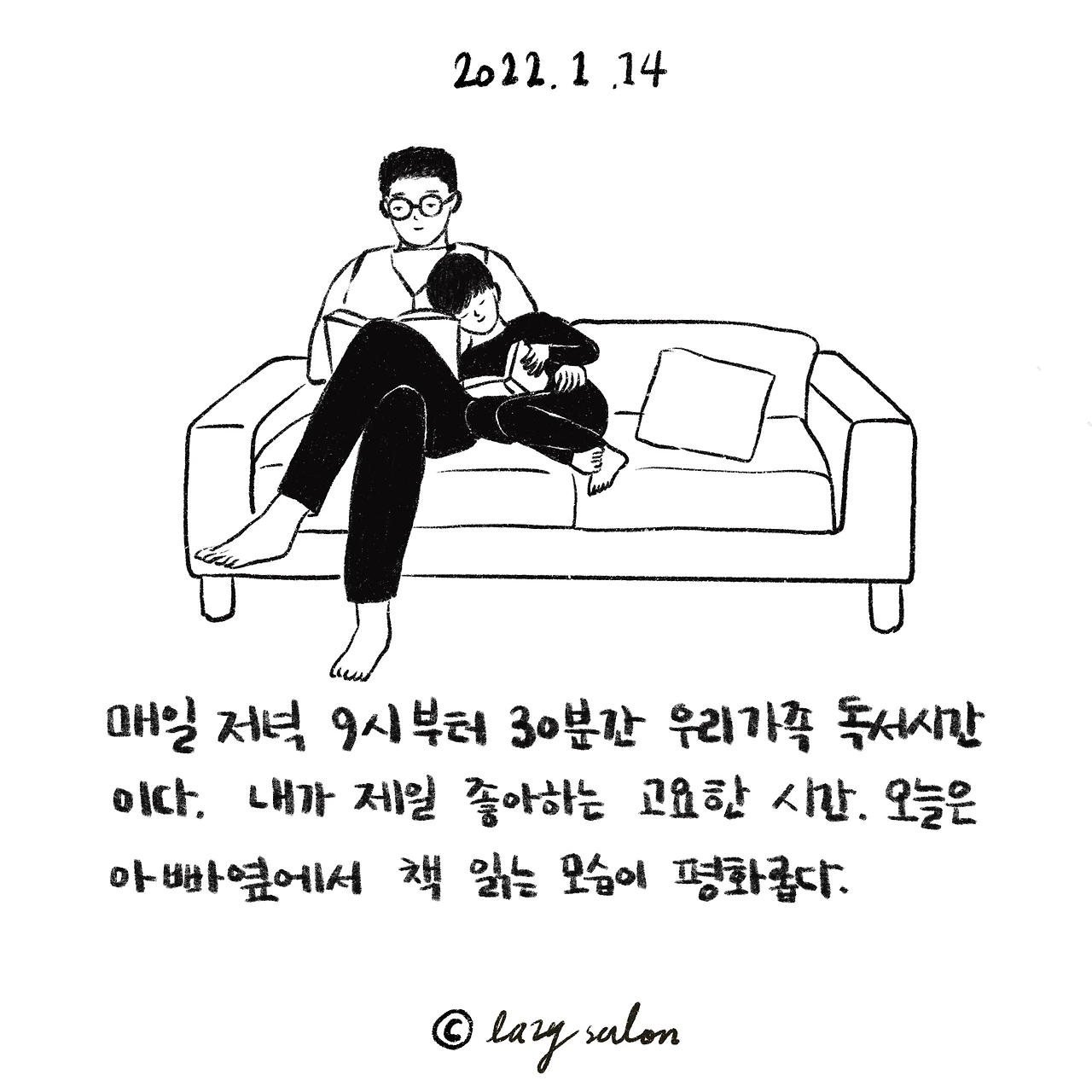지금은 아이가 책에 대한 흥미를 계속 잃지 않게 하기 위한 노력을 하고 있다. 나는 어렸을 때 책을 좋아하지 않았고 성인이 되어서 책의 즐거움을 알게 된 경우라 우리 아이에게는 일찍부터 책의 즐거움을 알려 주고 싶기도 하다. 그래서 꾸준히 도서관도 데리고 다니고 책도 많이 읽어주고, 아이 수준에 인기 있는 책들을 빌려서 보여주곤 했다. 그중에 반은 성공하고 반은 실패했지만, 성공한 책은 아이가 작가를 기억하고 그 작가의 다른 책들을 찾아서 빌려 달라고 하기도 했다. 하지만 스스로 읽는 건 언제나 어려웠다. 매일 퇴근하고 와서 책 읽는 시간을 갖아야지 했으나 저녁 준비하고 정리하다 보면 책 읽는 시간은 항상 건너뛰게 되었다. 그래서 독서시간을 아예 고정시켜 버렸다. 9시부터 30분간 독서시간을 갖게 된 지 2-3달이 되어서 남편도 아이도 9시가 되면 각자 읽을 책을 가지고 거실에 모인다. 며칠 전에는 셋다 재미있는 책을 읽는지 너무 조용히 30분이 지나가 버려서 깜 짝 놀라고 말았다. 보통은 읽다가 한 마디씩 하곤 했는데 이렇게 셋다 집중한 건 처음이라 놀라우면서 기뻤다. 그리고 각자 집중하고 있을 때 느껴지는 차분해지는 공기가 거실을 감쌀 때 행복감을 느꼈다.