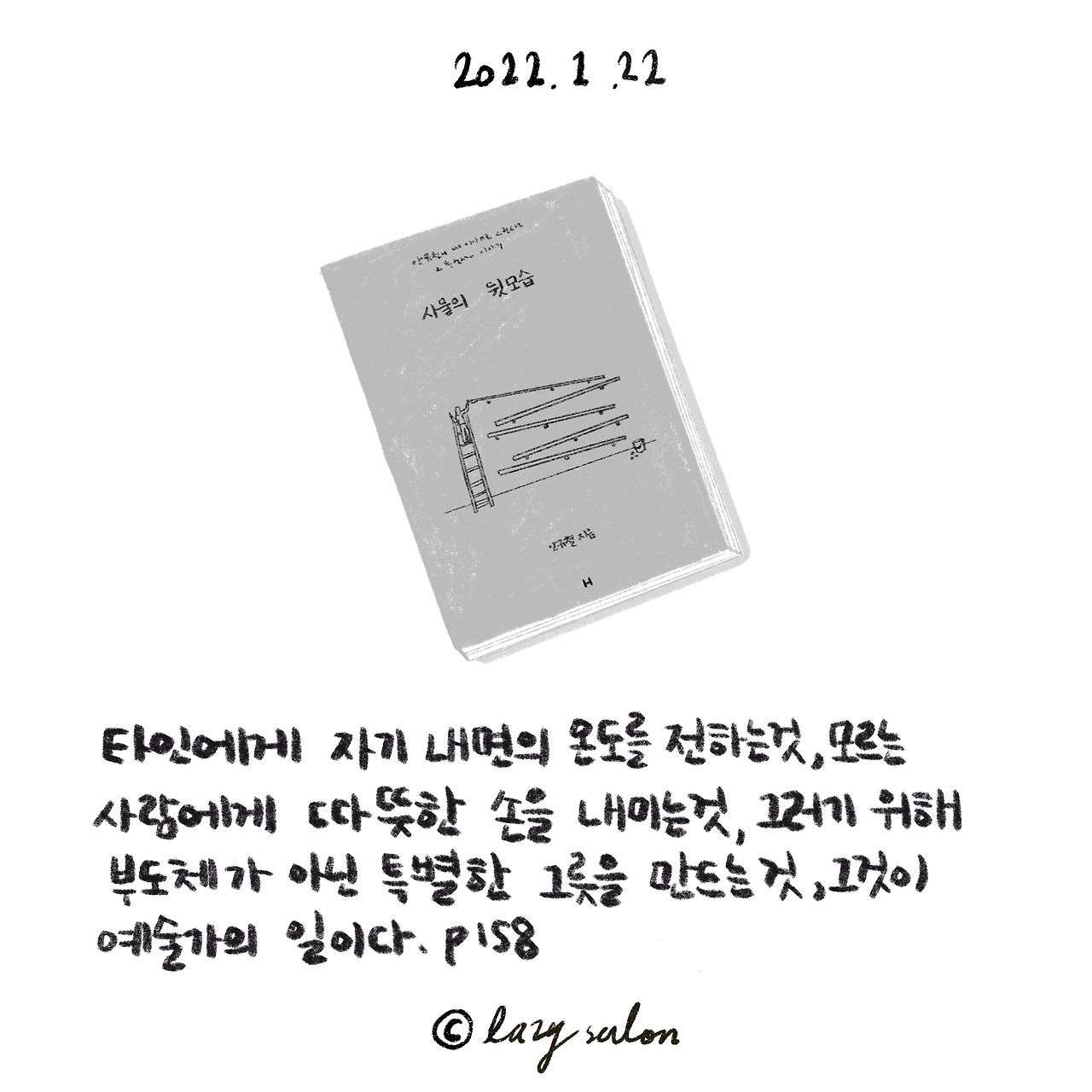 예전에는 나는 그림과 글을 쓰는 걸 쉽게 생각해서 마음만 먹으면 쓸 수 있다고 생각했던 적이 있다. 매일의 글을 쓰며 기록한 지 얼마 되지 않아 내 글을 돌아보면 지금 내가 쓰고 있는 글들은 사유할 수 있는 글보단 그날의 메모에 더 가깝다. 이제는 짧은 글에 함축적인 의미를 가지고 쓴다는 게 얼마나 어려운 일인지 알고 있다. 깊은 생각과 성찰 없이 나는 예술가라고 할 수 있을까. 나도 예술을 할 수 있을까. 내가 하는 것들과 행위의 본질에 가까워지기 위해 계속 책을 읽고 있는데 요즘 책을 읽을수록 나에게 꽂히는 글들은 나를 계속 깨우는 언어들인 것 같다. 내가 요즘 고민하는 것은 나의 재능으로 다른 사람들에게 선한 영향력을 끼치며 살아가는 것이다. 그래서 더 예술가라는 말에 꽂혀 있는지도 모르겠다. 책을 읽다 보면 작가들은 깨달음을 얻은 순간을 경험하던데, 예술가에겐 영감이 오는 순간이 아닐까. 사물의 본질을 알고 있어야 그 이면까지 꿰뚫어 볼 수 있지 않을까 생각했다. 이 책을 읽고 다음 책으로 철학책을 대여했다. 지금의 나로서는 깨달음을 얻을 수 없기에 책의 힘을 빌려본다.