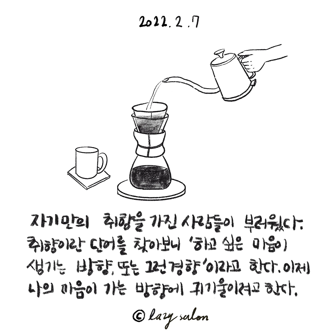 취향이란 단어를 찾아보니 '하고 싶은 마음이 생기는 방향. 또는 그런 경향'이라고 한다. 뭔가 고급 취향, 독특한 취향 이란 말만 써봤지 뜻을 제대로 생각해본적이 없다. 취향은 개성이 강한 사람들에게 있어 보이는 단어라고 생각했는데 뜻을 알게 되니 누구에게든 적용할 수 있는 단어였다. 그리고 생각해보면 내가 부러워했던 사람들은 본인의 취향을 명확하게 알고 남에게 이야기할 수 있는 사람들이었다. 그래서 그런 사람들을 자세히 들여다보니 그러한 취향을 알게 되기까지 끊임없이 자기에 대해 질문하고 알아가는 과정을 겪은 사람들이었다. 그렇다면 나는 어떤가. 나는 누군가가 취향해 대해 물어봤을 때 당황하고 항상 제대로 대답하지 못했던 것 같다. 나의 마음이 가는 방향에 대해 깊게 생각해본 적이 별로 없었다.