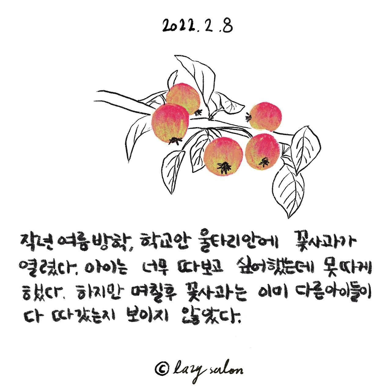 지난 여름 방학 때 아이 초등학교 안 울타리 안에 조그마한 꽃사과가 열렸다. 신기해서 아이에게 "저기 봐~ 사과가 열렸어" 하고 가르쳐 주니 아이는 따고 싶어서 안달이 났다. 하지만 나는 당연히 못 따게 했다. 우리 것이 아니고 학교 안에서 키우는 거라 안된다고 이야기했는데 지나고 생각해보니 못 따게 한 게 맞았나 의문이 들었다. 이미 방학이었고 며칠 지나니 이미 그 사과는 다 없어져 있었기 때문이다. 나는 항상 룰을 중시하고 룰을 깨는 걸 좋아하지 않기에 아이에게도 룰을 지키는 건 사회적인 약속이기에 지켜주어야 한다고 가르쳐 주었는데, 그 룰로 인해서 아이가 다시는 그 사과맛을 궁금해하지 않으면 어떡하지 하는 걱정이 되었다. 룰을 지키기 위해 인하여 호기심을 눌러야 하는 게 지금 이 시대에 맞는 걸까 고민이 들기도 했다. 가끔은 필요 없는 규칙도 있고 안 지켜도 되는 규칙들이 있다. 남에게 피해 주지 않는 선에서 가끔은 그 룰을 깨도 될 때가 있는데도 나처럼 못 깨게 될까 봐 두려워졌다.