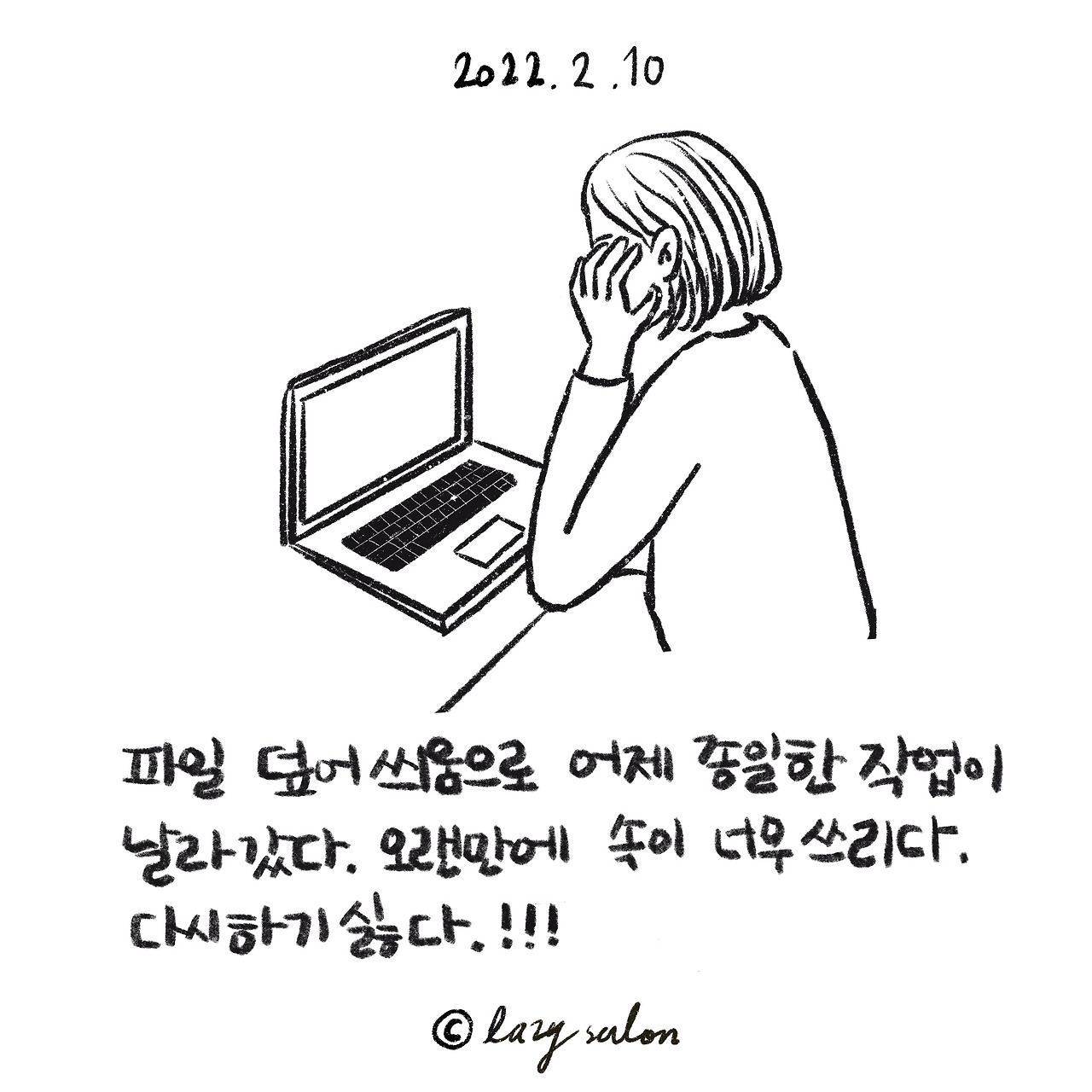 보통 그래픽 작업할 때 기존 작업 사이즈를 유지하느라(또는 귀찮거나, 왜 새 파일 열어서 사이즈 입력하는 게 그렇게 귀찮은 일인가) 기존 파일에서 세이브 에즈(다른 이름으로 저장)로 파일을 새로 만들어 기존 파일을 지우고 작업한다. 하지만, 몇 장의 비슷한 포맷을 만들다 보니 기존 열심히 작업한 파일을 버리고 새로운 파일을 덮어 그냥 컨트롤 에스(저장)를 눌러 버렸다. 항상 저장 안 하고 날아가는 게 일이다 보니 컨트롤 에스는 단축기로 작업 중간중간 이루어지는데, 요즘은 작업하다가 아이 데려다주고, 간식 주고, 왔다 갔다 하다 보니 이 파일이 무슨 파일 인지도 모르고 그냥 손가락이 본능적으로 컨트롤 에스를 열심히 눌렀던 것 같다. 다음날 아침에야 파일을 열어보고 나니 해당 파일에 엉뚱한 파일이 올라와 있는 걸 보고 속이 너무 쓰렸다. 컨트롤 제트 (되돌리기)도 발휘할 수 없는 상황이었다. 오랜만에 컴퓨터로 작업 중이라 이 속 쓰린 기분을 오랜만에 느꼈다. 누구에게도 뭐라 할 수 없고, 누구도 나무랄 수 없는데 모두가 내 잘못이고, 내 실수이며, 내가 혼자 처리해야 하는 이 상황!