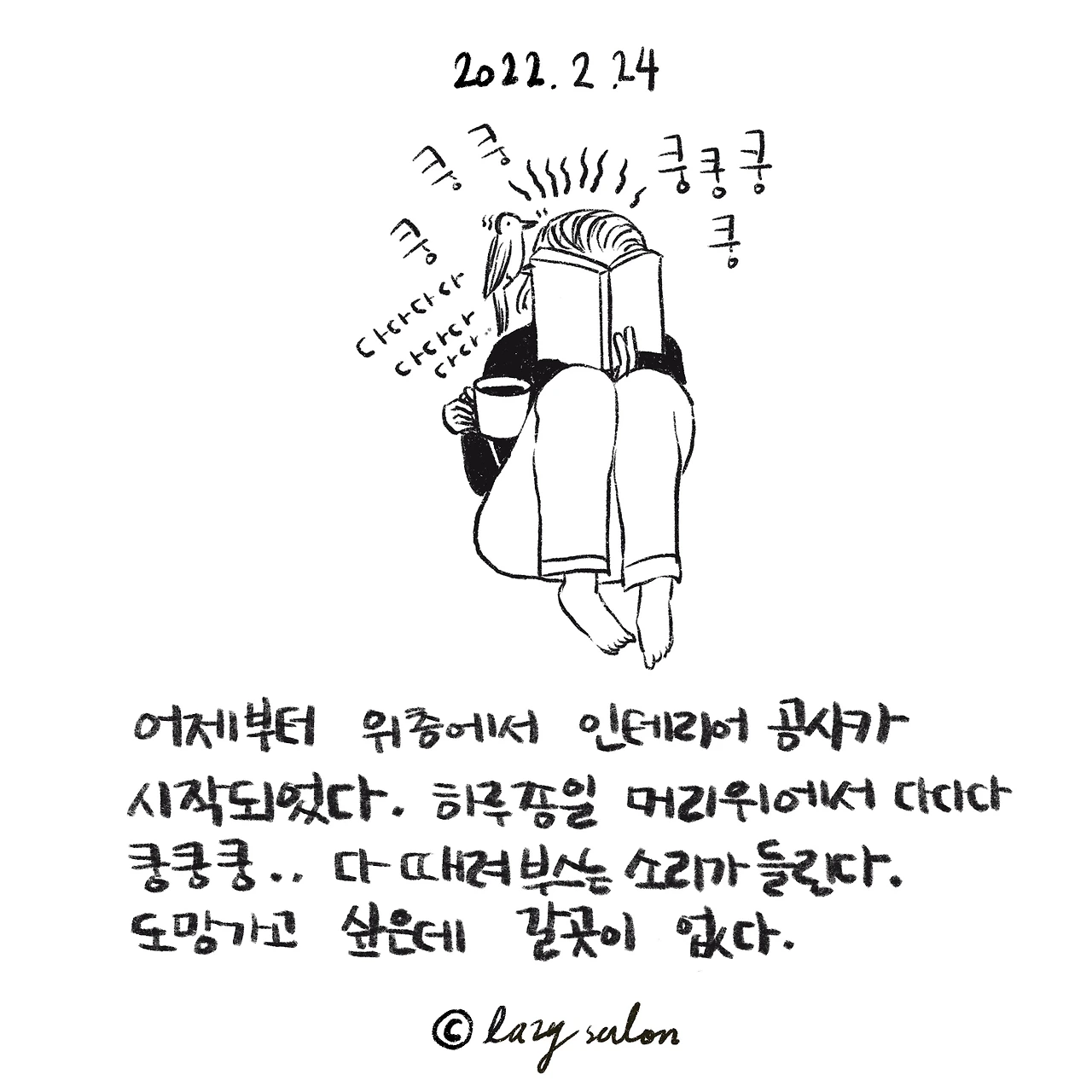 며칠 전 윗집 인테리어 공사 동의서를 사인해줬다. 바로 다음날부터 3일간 예정이었는데 생각보다 힘들다. 옆쪽 라인의 4층 윗집에서 때려 부수고 있는 게 느껴진다. 아침부터 다다다 다다다 다다, 쿵쿵 쿵쿵 소리가 계속 들리다가 12시쯤 되어 멈춘다. 1시쯤 다시 시작한다. 다다다 다다다 다다. 어제는 6시 가까이까지 시끄러웠는데, 오늘은 4-5시 사이부터 안 들리기 시작했다.