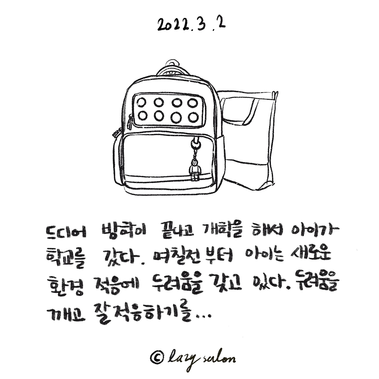 아이는 오늘 개학을 해서 학교를 갔다. 어제부터 개학의 두려움에 떨었다. 왜 두려울까? 아이와 이야기해도 마땅히 두려울 것이 없다. 선생님을 새로 만나긴 하지만, 첫날부터 혼을 내시진 않을 거다. 친구들이 새로 모이긴 하지만 1학년 때처럼 아예 모르는 아이들이 있는 것도 아니고 1학년 때 같은 반이던 친구들, 돌봄 교실에서 만난 친구들, 놀이터에서 만난 친구들이 모여 있다. 2학년 교실도 어디 있는지 방학중에 돌봄 교실을 다니며 이미 파악하고 있다.
