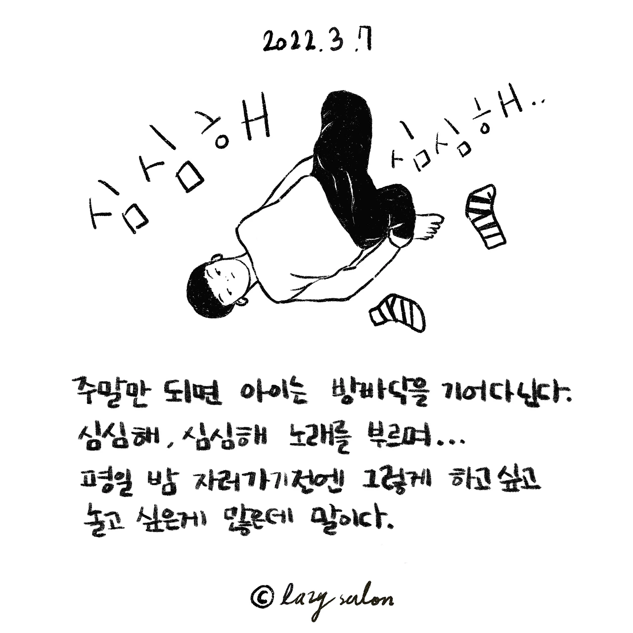 그럴 때마다 외동이라 미안한 맘이 들기도 하면서, 혼자 잘 놀아주면 좋겠다는 생각을 한다. 남편과 함께 셋이 시간을 정해서 보드게임을 함께 하기도 하고 도서관을 같이 다녀오기도 하는데 집중해서 볼만한 책을 찾지 못했다. 아이는 내내 엄마 아빠와 놀고 싶어서 매달린다. 오전, 오후 TV 시청 시간 외에는 주체적으로 놀이를 못하고 있는 아이를 보면, 그 시간에 집중할 수 있는 걸 찾아서 쥐어 주고 싶다는 생각이 들면서도, 심심한 걸 견디다 보면 스스로 찾지 않을까 하고 기다려본다. 너무 미디어에 의존하게 두고 싶지 않다. 한동안은 책 만드는데 빠져서 내내 종이를 접고 잘라서 책 만들고 이야기를 그리느라 집중했는데, 요즘은 재밌는 걸 발견하지 못한 것 같다. 지난 주말엔 내내 기어 다니느라 나무늘보 같은 시간을 보냈다. 스스로 재미를 찾을 수 있도록 엄마가 해줄 수 있는 게 뭐가 있을까. 무언가 하고 싶게끔 동기부여를 할 수 있는 방법을 찾아봐야겠다.
