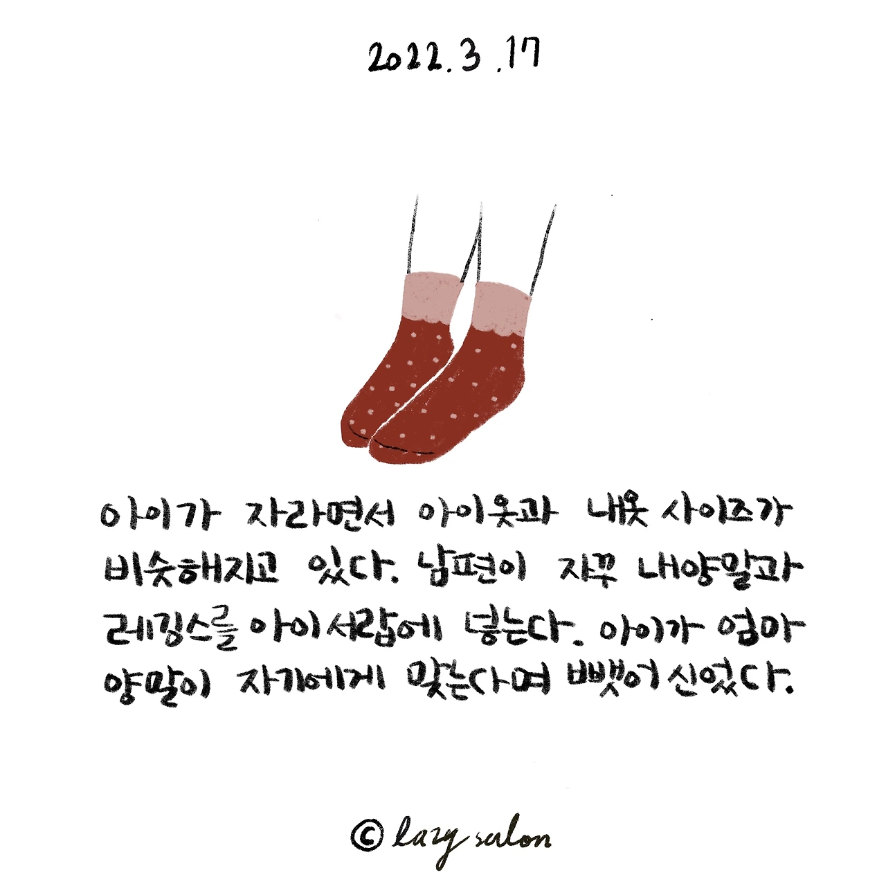 아무리 찾아도 안보이던 내 티셔츠, 레깅스가 아이 옷장에 들어가 있었다. 남편이 구분 못하고 아이 서랍에 넣은 것이지만 아이의 검은 내복 바지와 내 레깅스 사이즈가 비슷해서 나 조차도 헷갈렸다. 어느 날은 내양말이 너무 없어서 보니 그것도 아이 서랍에 들어가 있다. 아이는 엄마 양말을 좋다고 신는다. 엄마 양말이 자기에게 맞는 것이 본인 스스로도 쑥쑥 크는 느낌이 들어서 인지 기분이 좋은 듯했다. 사실 그 양말들은 건조기에 들어가서 작아진 양말이었는데, 제 주인을 찾아간 듯하다. 아이는 엄마 양말이 뭐가 좋은지 더 편하다며 오늘 아침에도 신고 학교에 갔다.
