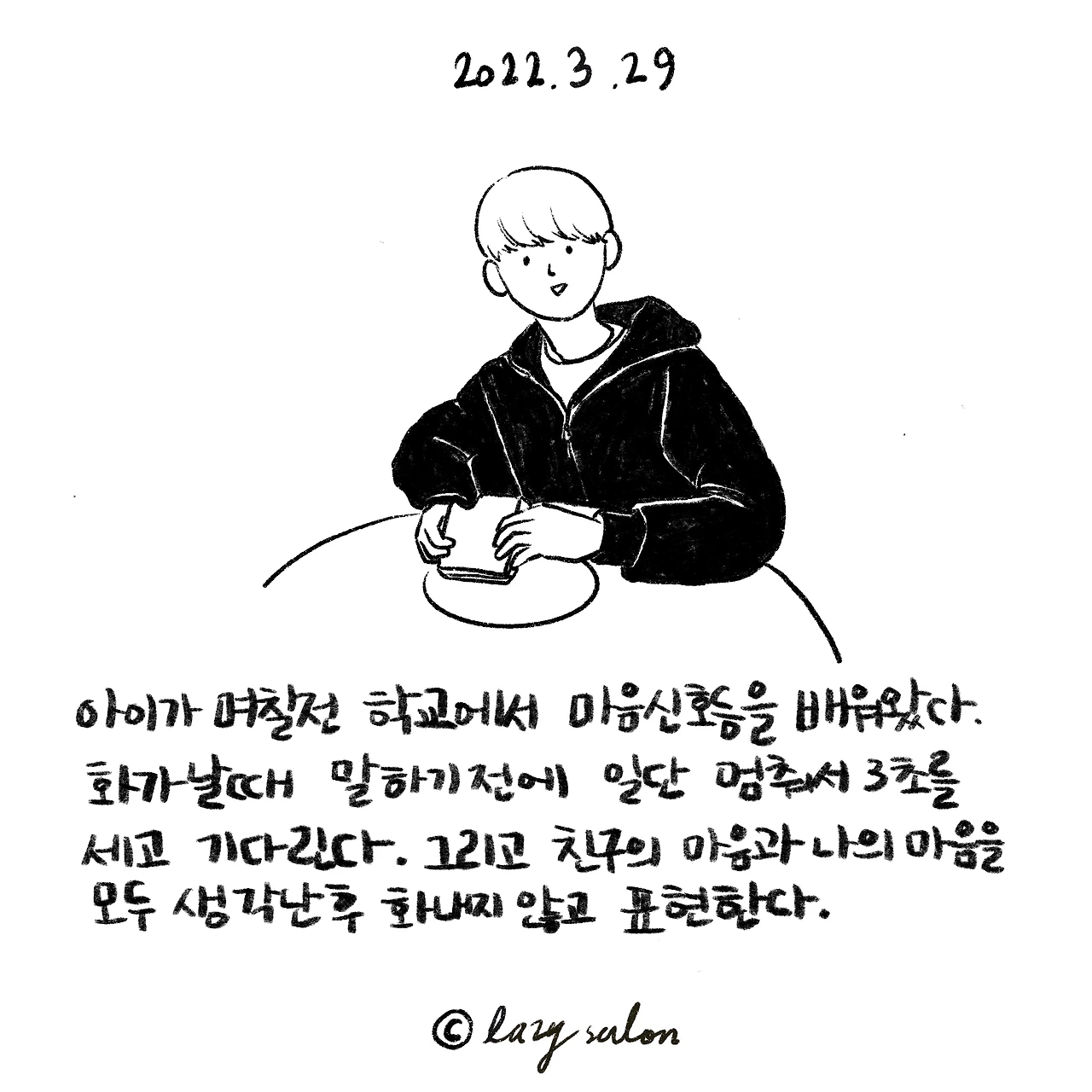 2학년 1학기 봄 교과서에 나오는 내용이다. 이름도 예쁘게 '마음 신호등'이다. 아이가 화가 날 때 스스로 화를 잠시 멈추고, 배운걸 그대로 실천하는 모습이 놀라웠다. 다만, 화가 난 포인트가 간식으로 준 식빵에 바른 크림치즈와 딸기잼의 순서가 안 맞았다는 게 우습지만.