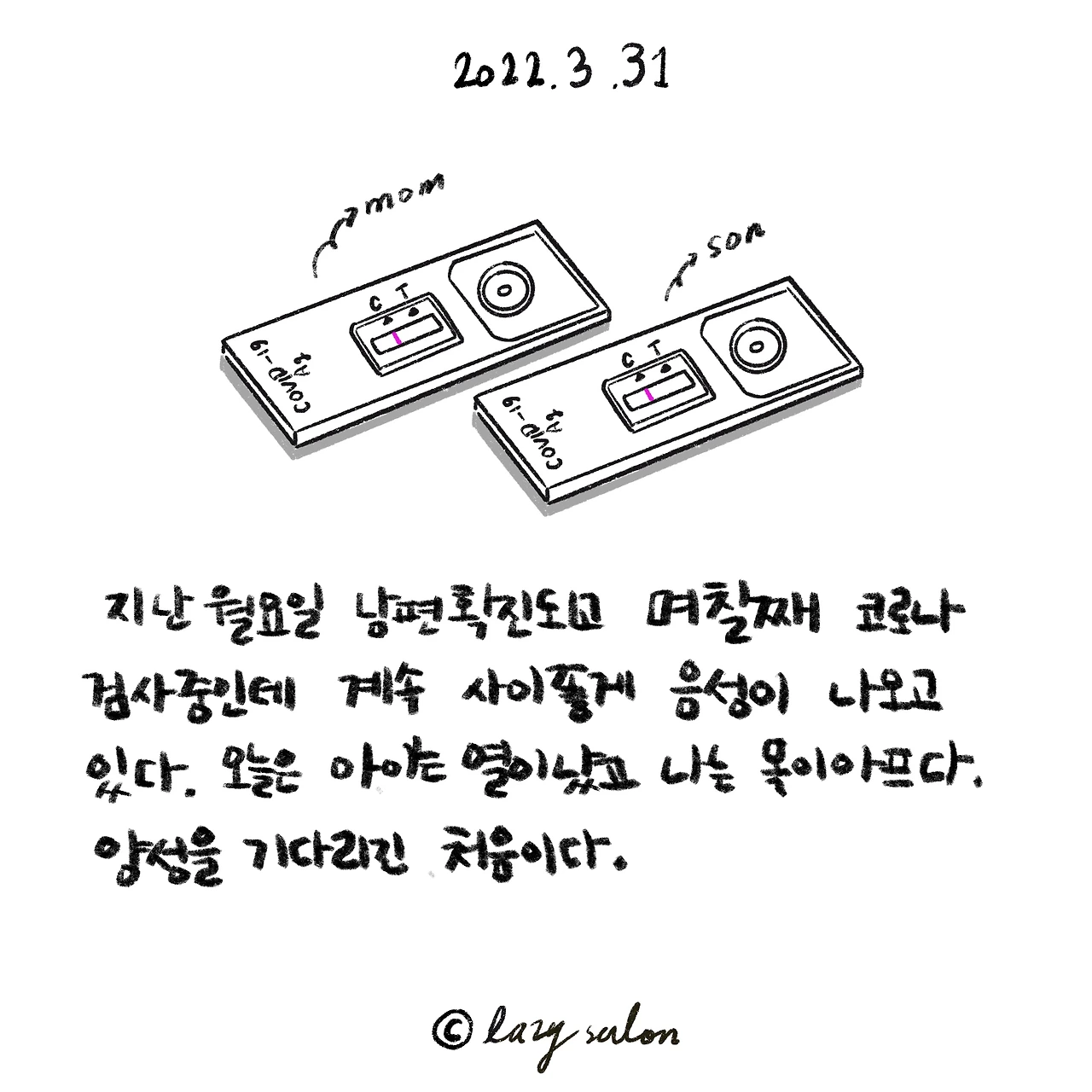 오늘은 둘 다 증상이 있어서 양성이 될 줄 알았다. 얼른 양성 판정을 받고 일주일 겪고 격리 해제가 되었으면 좋겠다고 생각했다. 아빠는 양성 판정에 우린 계속 음성이니 애매한 상황으로 세 식구가 내내 집에 있다. 어떤 사람들은 아무리 마스크를 꼭꼭 싸고 소독을 해도 양성이 나오고, 어떤 사람들은 마스크 벗고 생활해도 음성이 나온다고 하니 답답하다.