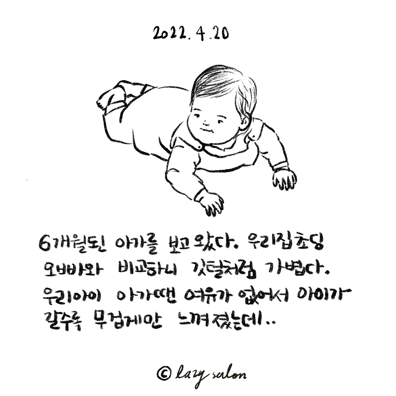 어제 지인의 6개월 된 아기를 보고 왔다. 조그마한 아기는 너무 귀엽고 예뻤다. 아이는 깃털처럼 가벼웠다. 우리 아이 키울 땐 8킬로가 너무 무겁게 느껴져서 조금만 안아도 버거웠다. 혹여나 안겨있는 버릇이 들까 봐 시어머니가 오셔서 아이를 오래 안고 있으면 속으로 조금 예민해졌었다. 그 시절이 지나고 나니 조금만 참고 견디면 되는 것을 알게 되었다고 6개월 아기가 마냥 예쁘고 귀여웠다.