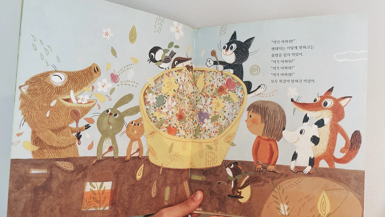 수채화의 포근포근한 일러스트에 강이와 동물들이 꽃밥을 만들어 먹는 장면이 내가 제일 좋아하는 장면이다. 꽃밥을 만들어 서로 아까워하며 먹는 모습이 책을 읽고 있는 나 또한 아까워서 '먹기 아까워~'라는 글에 공감되었다. 알고 보니 이 책은 보림 출판사에서 출간한 책으로 왠지 더 친근감이 든다.