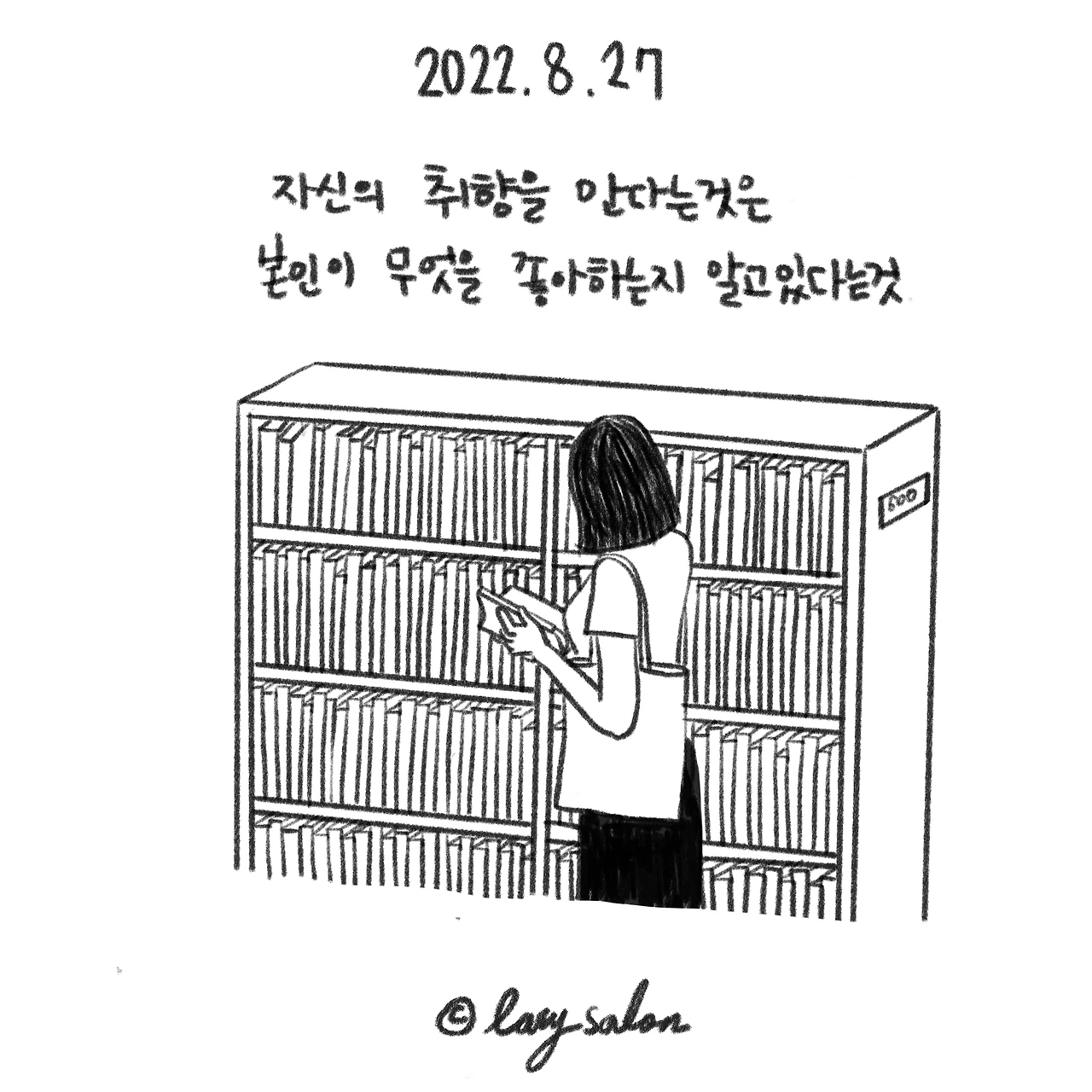 그림 유튜버 `이연`의 자신만의 분위기를 만드는 것에 관련한 동영상을 본 적이 있는데 현재 본인의 분위기가 마음에 들지 않는다면 기존에 자신이 가진 것 중 별로라고 생각했던 것들을 정리해보라고 했다. 내가 다니는 직장, 만나는 사람들, 입고 있는 옷, 쓰고 있는 물건들을 정리하며 나에게 안 좋은 걸 주는 분위기는 보내야 한다고. 나쁜 것이 나에게 스며든다고 생각하며 피하도록 한다고 했다. 마음에 들지 않지만, 가격으로 타협했던 것들은 마음에 드는 제품으로 바꾼다. 한순간에 모두 바꿀 수는 없지만 하나씩 서서히 바꾸다 보면 내 취향이 나타난다. 내가 선택한 것들에 의해 취향이 나타나고 나의 분위기가 형성된다.