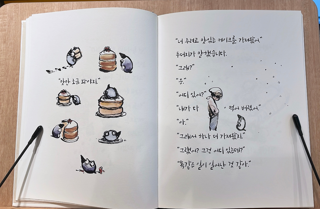 '소년과 두더지와 여우와 말'이라는 서로 안 어울리는 세 동물과 소년이 만나 함께 대화를 나눈다. 작가는 이 책은 우정에 관한 책이라고 했지만 나는 이 책으로 삶의 태도와 방식에 대해 느꼈다. 굵고 얇은 선의 대비가 역동적으로 느껴지는 일러스트와 작가의 손글씨로 써진 책은 그림책으로 봐야 할지 철학서로 봐야 할지 구분하기 어려웠다. 짧은 글과 그림으로 페이지가 가득하지만 짧은 문장 안에 함축된 인생을 대하는 태도가 느껴진다. 한글 번역본으로 필기체 느낌이 왠지 투박한 느낌이 들어 원서를 찾아보았다. 작가의 필기체와 일러스트의 조화가 번역본의 조금 어색했던 부분을 채워주는 느낌이어서 바로 원서를 구입했다.