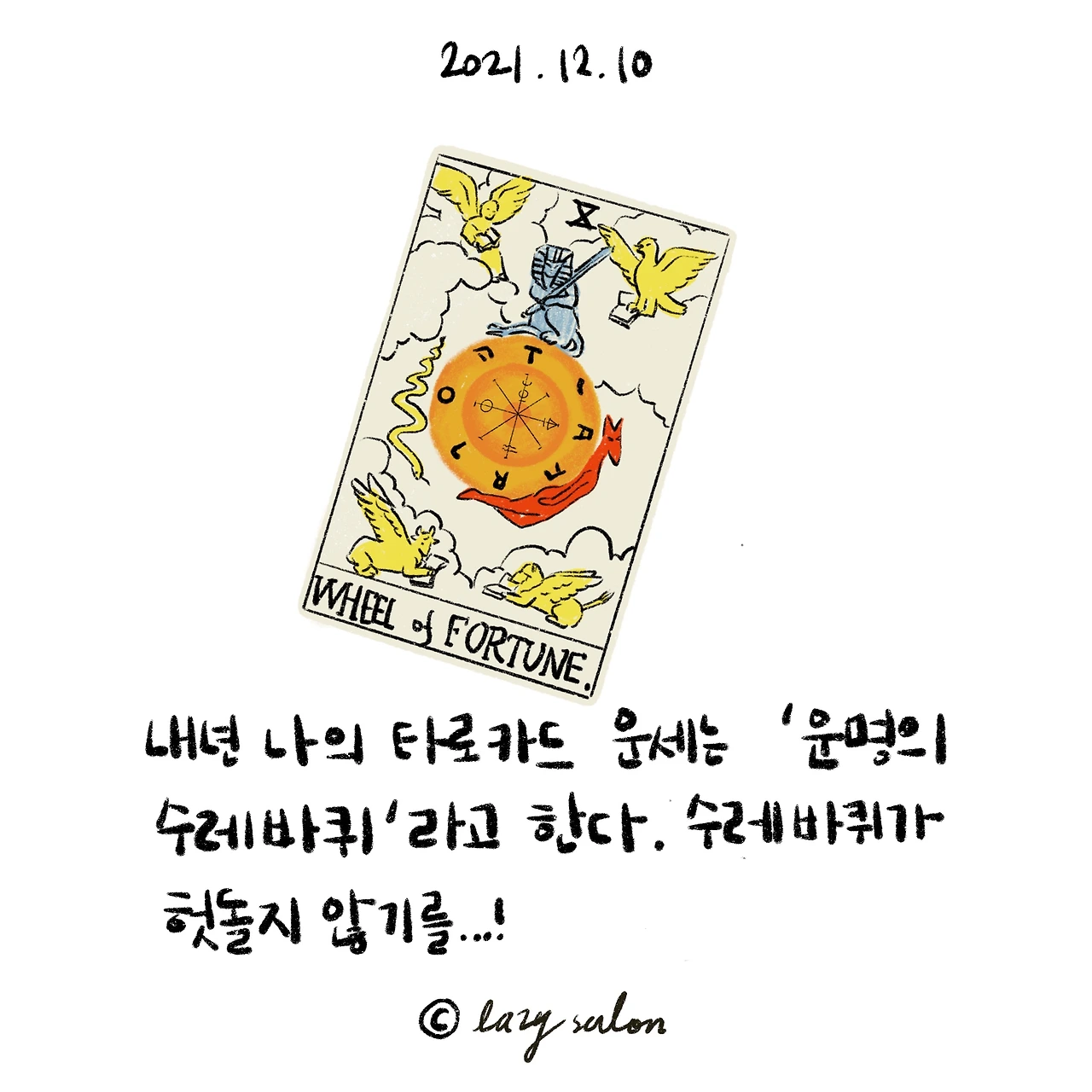 내년 나의 타로카드의 운은 ‘운명의 수레바퀴’라고 한다. 이 카드는 이동, 움직임, 변화, 행운, 터닝포인트, 역마살, 순환, 새로운 시작, 반복의 의미를 가지고 있는 카드다. 좋은 카드지만 내년을 위해 준비를 해놓지 않으면 헛바퀴가 도는 카드라고 한다. 내 타고난 운에 노력까지 더하면 더할 나위 없을 거란 생각을 해본다.