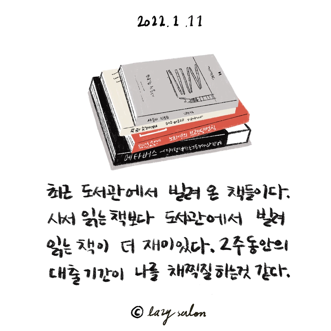 그에 반해 도서관에서 빌려보는 책은 금방 다 읽어 버린다. 나의 성향을 알기에 웬만하면 도서관에서 책을 빌려보곤 하는데 한동안 코로나 19로 휴관해서 도서관에 못 가다 보니 다시 책을 사면서 안 읽는 책이 집에서 나뒹굴게 되었다. 마감기한이 있어야 움직이는 성향 때문인지도 모르겠다.