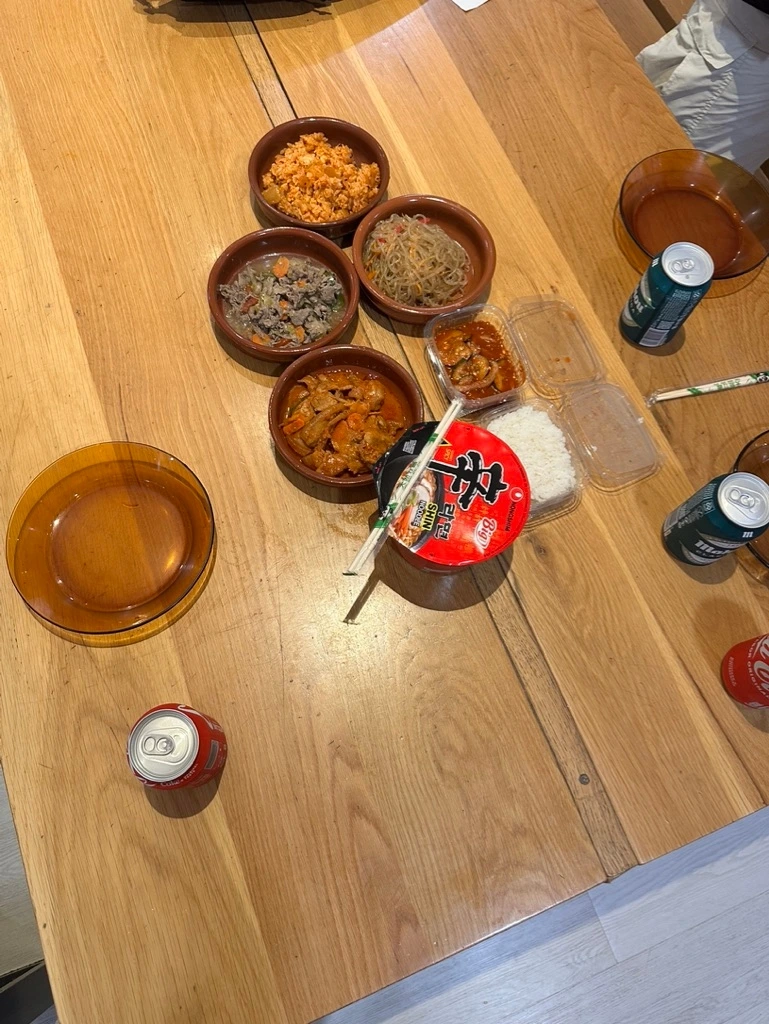 부르고스에는 유명한 한식집이 있다. 십여 일 하몽 끼워진 바게트를 씹다 보면 지금이 딱 한식 먹기 좋을 시점이다. 하지만 안타깝게도 오늘은 쉬는 날이라 차선으로 한국 도시락(반찬) 가게를 가보기로 했다. 준호와 그가 소개해준 태훈까지 셋이 오늘 점심 메이트가 됐다. 한식집 휴무 영향인지 몇 가지 반찬은 이미 솔드아웃이다. 남은 반찬 여러 종류를 포장해 와 숙소 주방에서 나눠 먹었다. 김치찌개의 감동까지는 아니지만 한식의 아쉬움을 달랠 정도의 식사였다. 앞으로 한식집이 또 있겠지.