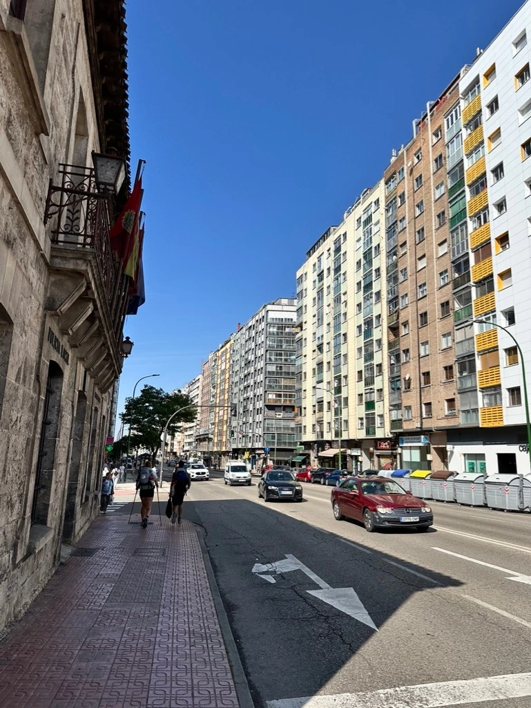 오늘은 출발부터 아스팔트 길이다. 한 시간 정도 걸어오니 부르고스 공항 활주로가 나타났다. 구름 한 점 없는 하늘로 작은 비행기들이 연달아 날아올랐다. 부르고스에 들어선 것은 지도를 보지 않고도 알 수 있었다. 4차선 도로 양 옆으로 죽 늘어선 크고 작은 공장들과 갓길에 주차된 대형 트럭들 사이를 한동안 지루하게 걸었다. 공장지대가 끝나니 높고 빽빽한 아파트 거리가 이어졌다. 시골의 모든 집들은 테라스와 창가에 예쁜 꽃이 담긴 화분을 놓아 자신의 취향과 센스를 드러내며 경쟁하듯 외관을 꾸몄다. 도시의 아파트의 창가는 메마른 시멘트뿐이다. 지나가던 마을 사람들과 나누던 인사도 사라졌다. 하긴 도시에서 마주치는 그 많은 사람들과 인사를 나누며 살아간다는 것이 말이 안 되긴 하지.