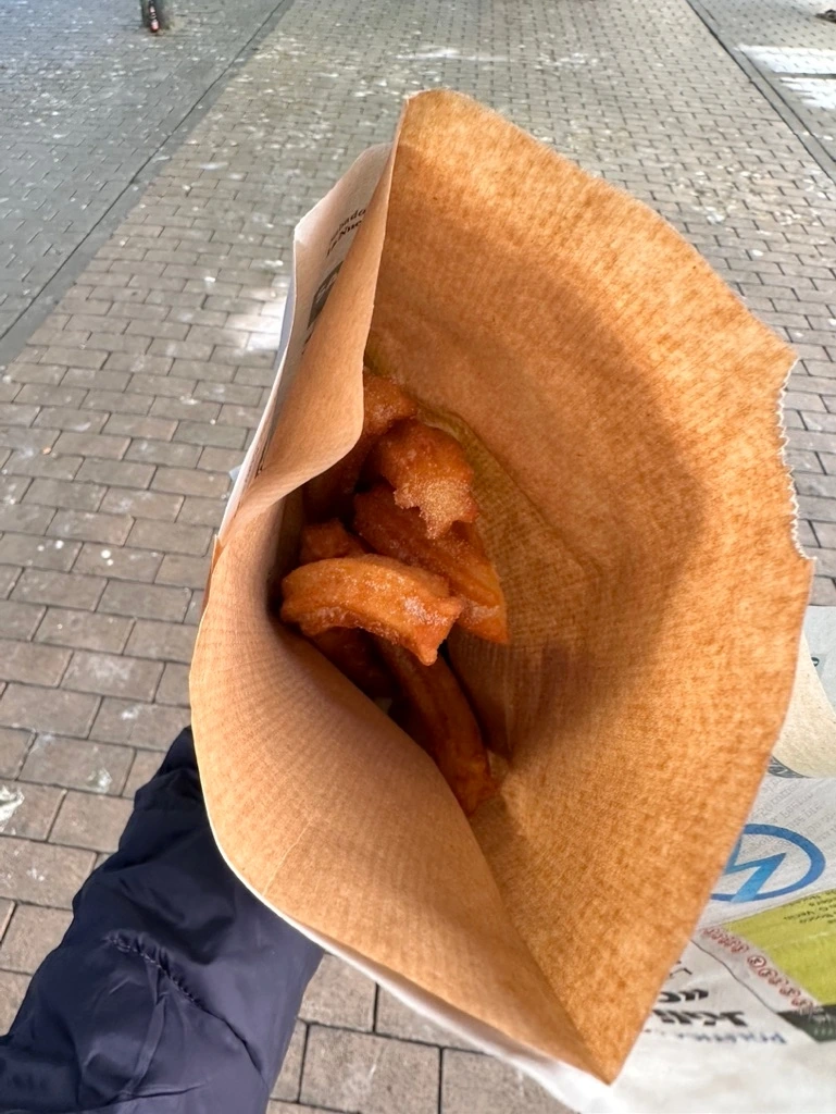 현지인이나 순례자들이나 보통 카페 콘 레체(라떼)를 마신다. 나는 소화가 잘 안 돼서 먹던 대로 아메리카노만 마셨는데 오늘은 쉬는 날이고 배탈이 나도 괜찮으니까 처음으로 카페 콘 레체를 시켜봤다. 커피 맛을 잘 모르긴 하지만 여기 라떼가 텁텁함이 덜하고 덜 느끼한 듯하다. 우유가 좋은 건가 커피가 좋은 건가. 츄러스를 욕심내서 5개나 샀는데 3개째부터는 억지로 먹었다. 꽈배기 먹고 싶다. 여기가 왜 맛집인지 모르겠어요..