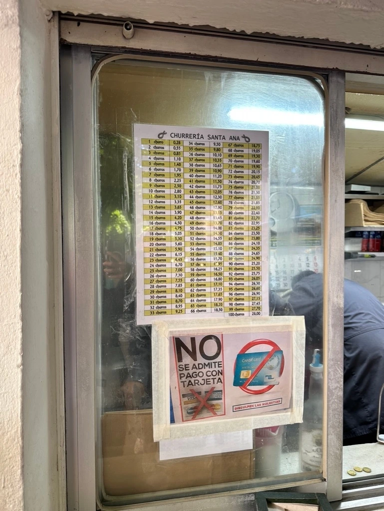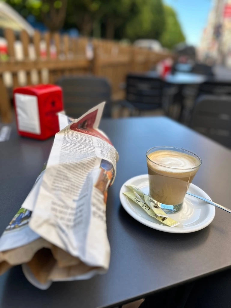 츄러스 가게도 부모님 나이만큼이나 오래된 곳이다. 현지 할아버지들도 줄을 서 계셔서 현지인 맛집임을 알 수 있었다. 1개에 0.28유로, 계산하기 편하게 100개까지 가격을 붙여놓았다. 한국에서도 이런 걸 붙여놓는 집을 봤던 거 같은데. 오로지 츄러스만 판매하고 포장만 하는 집이라 음료와 함께 먹고 싶으면 근처 카페에 가지고 가면 된다. 카페 안에서 츄러스를 먹는 사람들도 있긴 했는데 왠지 눈치가 보여서 커피를 시켜서 테라스로 가지고 나왔다.